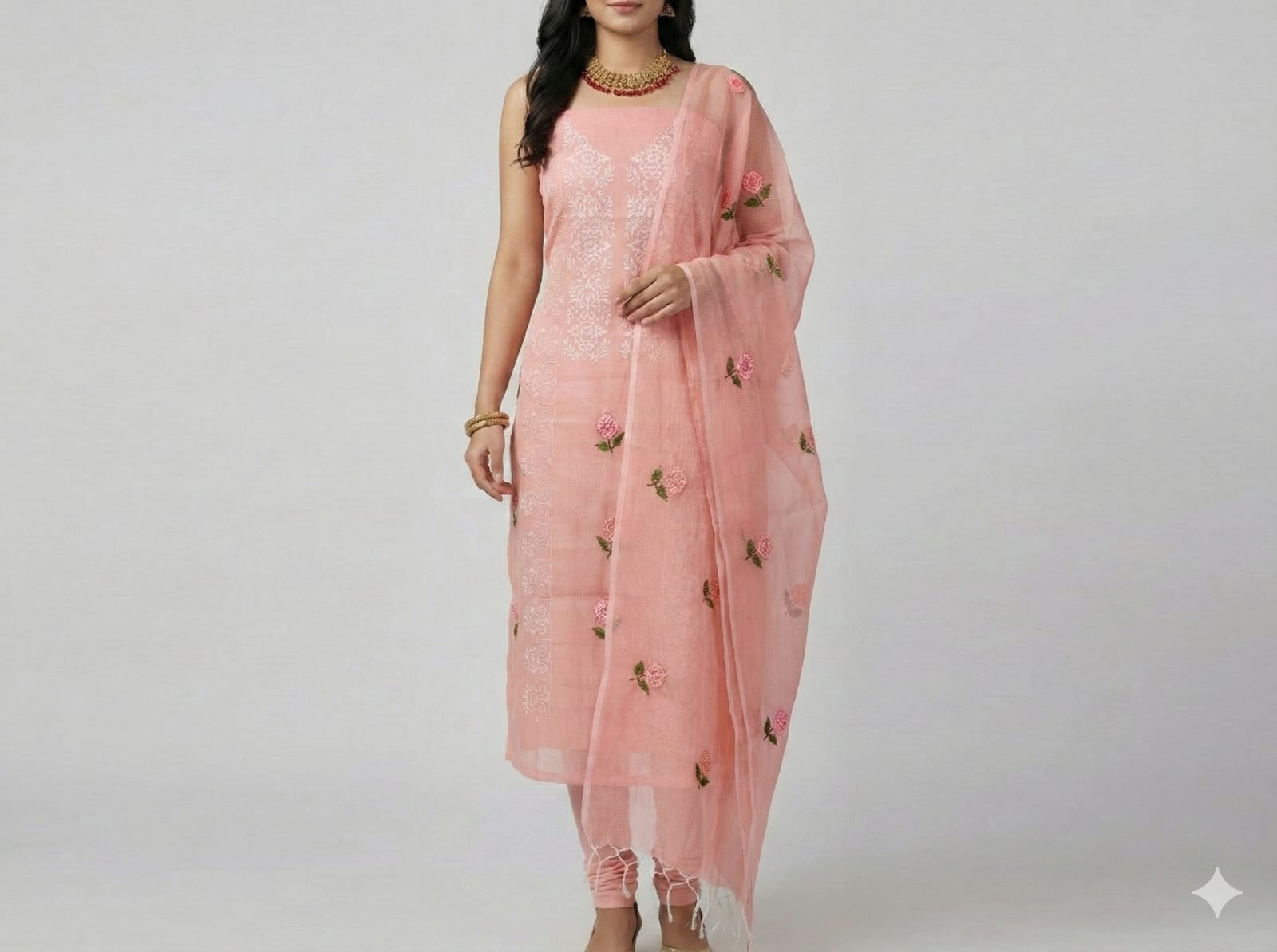 Intricate Kota Doria Chickenkari Suit Dress Material. A Beautiful Cross Stich Embroidery on Kurta with Neck Work om Kurta and small bootis on the Duppata. These Kota Doria Chickenkari Suit are Very Opulent and Can Be Used For Casual or Office Purpose. The Material is Hand Woven Cotton Kota Doriya Material. The Dress Material is of PEACH Color and the Bottom will be also the same Color.