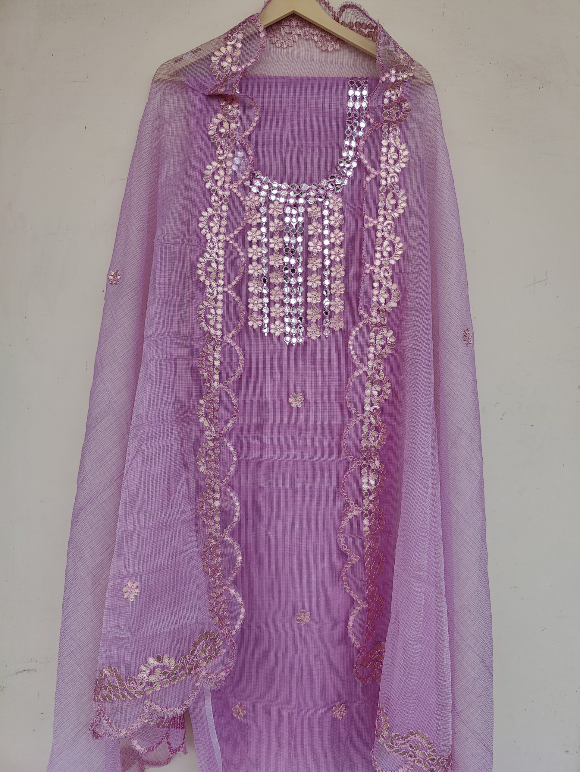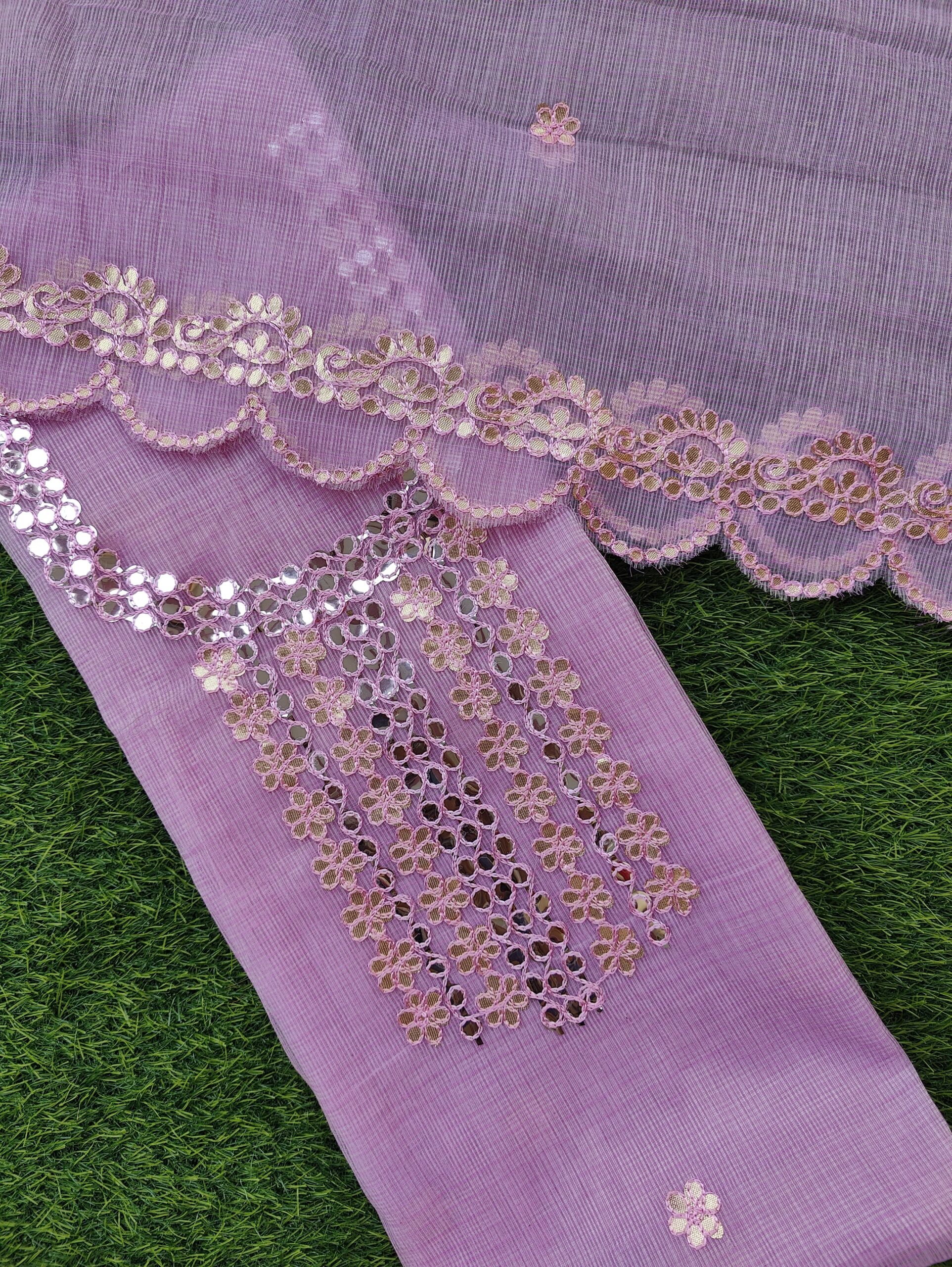 Premium Quality Kota Doria Gotta Suit with Resham Embroidery Work and Cutwork Duppata . A Very Classy And Elegant Kacha Gotta Work on Kurta and Duppata on Kota Doria Materail. The Material is Hand Woven Cotton Kota Doriya Material. The Kurta and Duppata is LAVENDER(LIGHT PURPLE) Color and the Bottom will be LAVENDER(LIGHT PURPLE) Color.