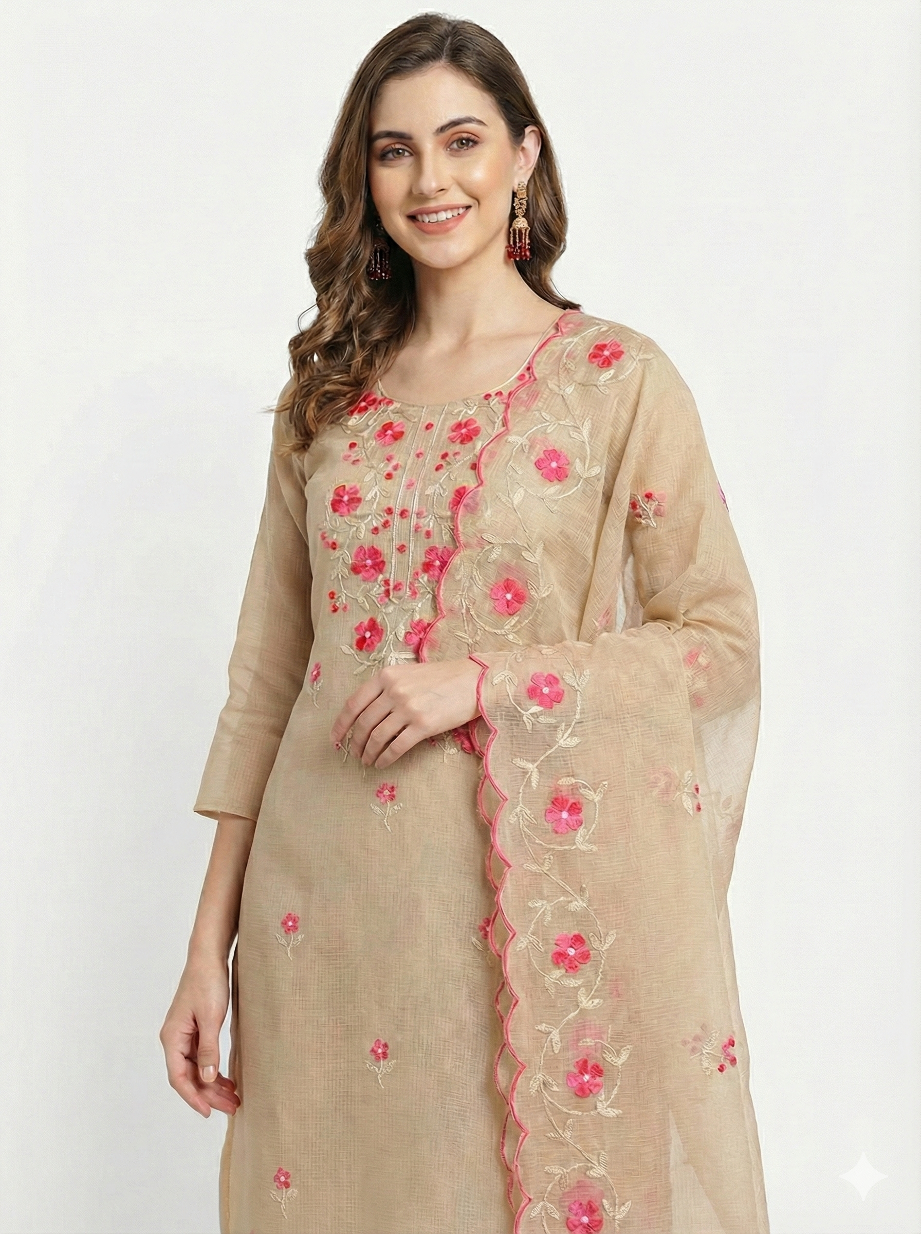 Exclusive Kota Doriya AARI Embroidery Suit Dress Material. A Beautiful AARI Work Embroidery on Kurta with Heavy AARI Work on the Duppata with Cutwork Border. The Material is Hand Woven Cotton Kota Doriya Material. The Dress Material is of BEIGE(CHIKOO) color and the Bottom will be BEIGE(CHIKOO) Color. This Kota Doriya AARI Embroidery Suit is a Very Sober and Exclusively Made with Hand.