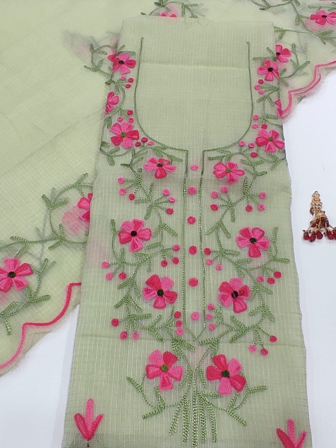Kota Doriya Aari Embroidery Dress Material. A Beautiful AARI Work Embroidery on Kurta with Heavy AARI Work on the Duppata with Cutwork Border. The Material is Hand Woven Cotton Kota Doriya Material. The Dress Material is of PISTA GREEN color and the Bottom will be PISTA GREEN Color.
