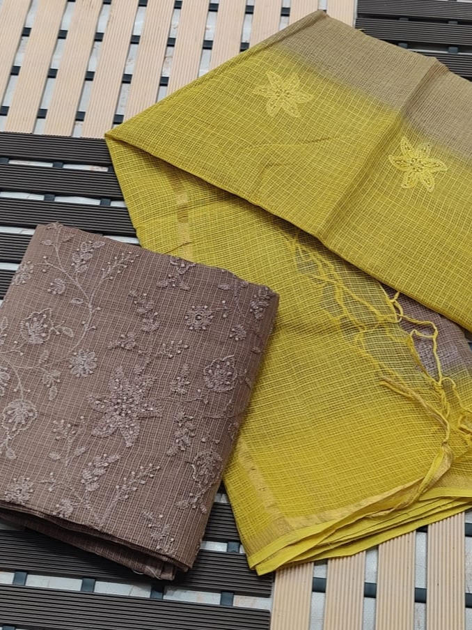 Handcrafted 100% Premium Quality Cotton Kota Doriya Chichkenkari Dye Suit Dress Material. The Kota Doriya Chichkenkari Dye Suit is Very Breezy and Comfortable in the Summer Heat. Kota Doriya Suit With Computer Chickenkari Embroidery Work with Contrast Dye Duppata. The Material is Hand Woven Pure Cotton Kota Doriya Material. The Kurta and Duppata is BEIGE(CHIKOO) with LEMON YELLOW Contrast Color and the Bottom will be LEMON YELLOW Color.