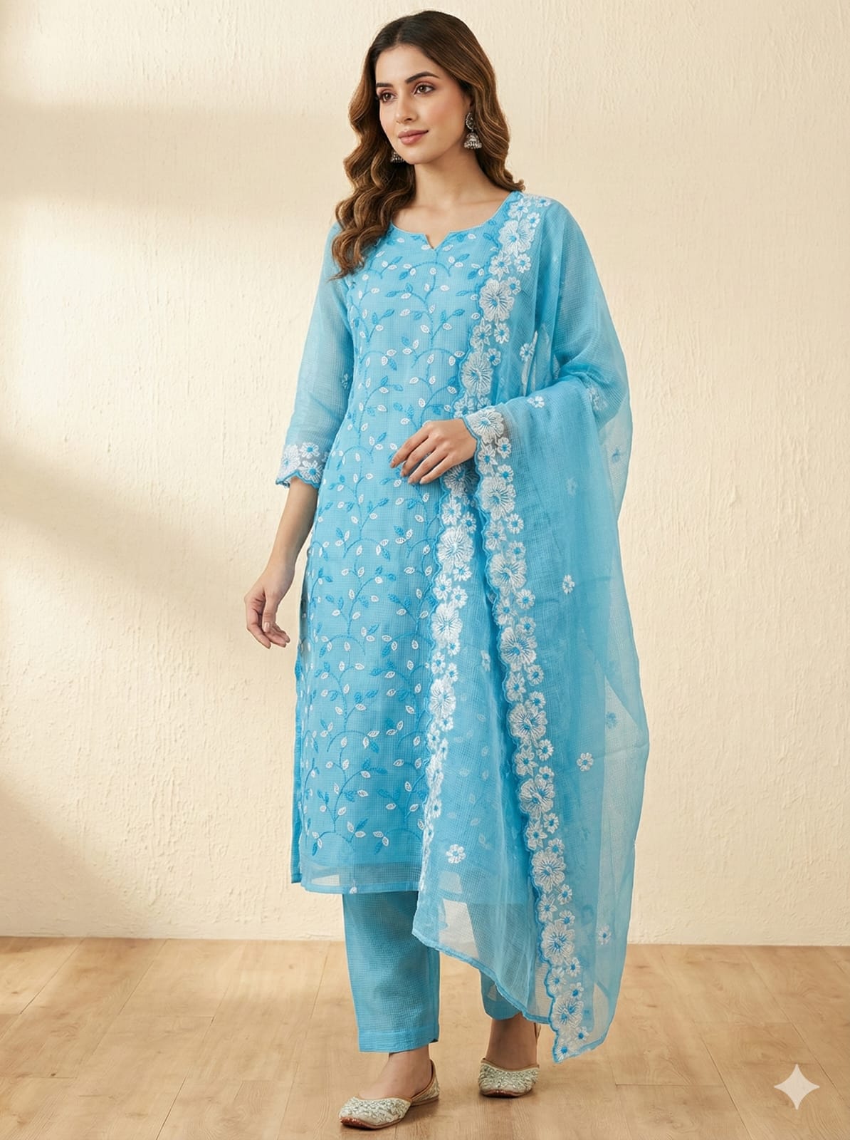 Premium Kota Doriya Chickenkari Suit Embroidery Dress Material. A Heavy looking Jaal Chicknekari Embroidery on Kurta with Cutwork Border Chickenkari Embroidery on the Duppata . The Material is Hand Woven Cotton Kota Doriya Material. The Dress Material is of SKY BLUE Color and the Bottom will be SKY BLUE Color.
