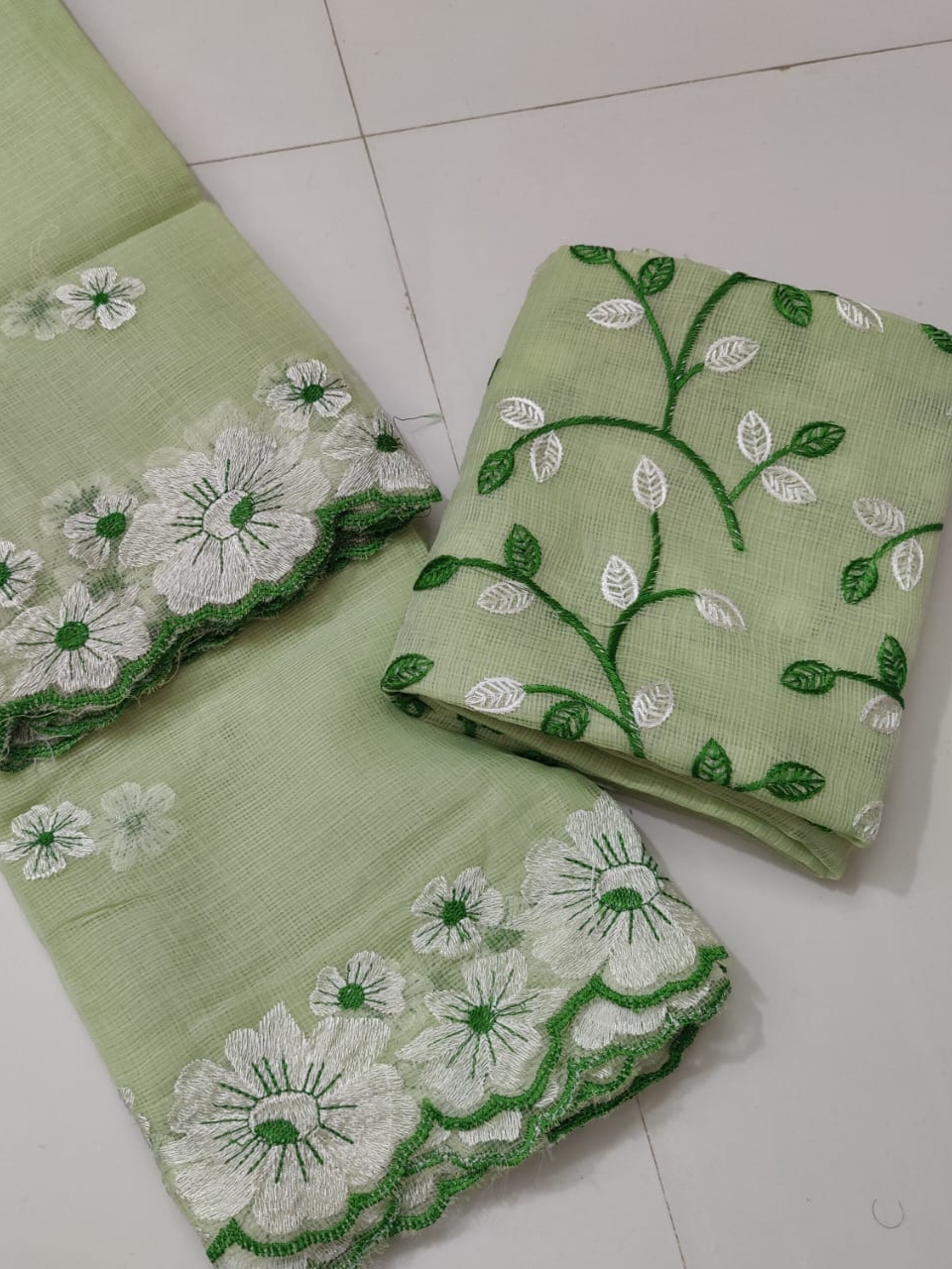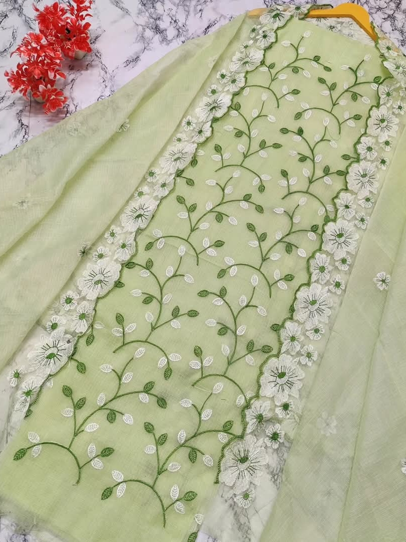 Kota Doriya Chickenkari Embroidery Dress Material. A Heavy looking Jaal Chicknekari Embroidery on Kurta with Cutwork Border Chickenkari Embroidery on the Duppata . The Material is Hand Woven Cotton Kota Doriya Material. The Dress Material is of PISTA GREENColor and the Bottom will be PISTA GREEN Color.