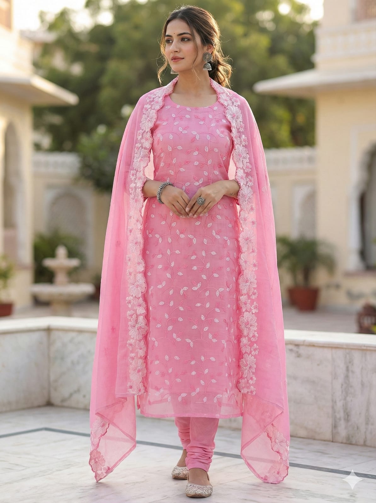 Premium Kota Doriya Chickenkari Suit Embroidery Dress Material. A Heavy looking Jaal Chicknekari Embroidery on Kurta with Cutwork Border Chickenkari Embroidery on the Duppata . The Material is Hand Woven Cotton Kota Doriya Material. The Dress Material is of BABY PINK Color and the Bottom will be BABY PINK Color.
