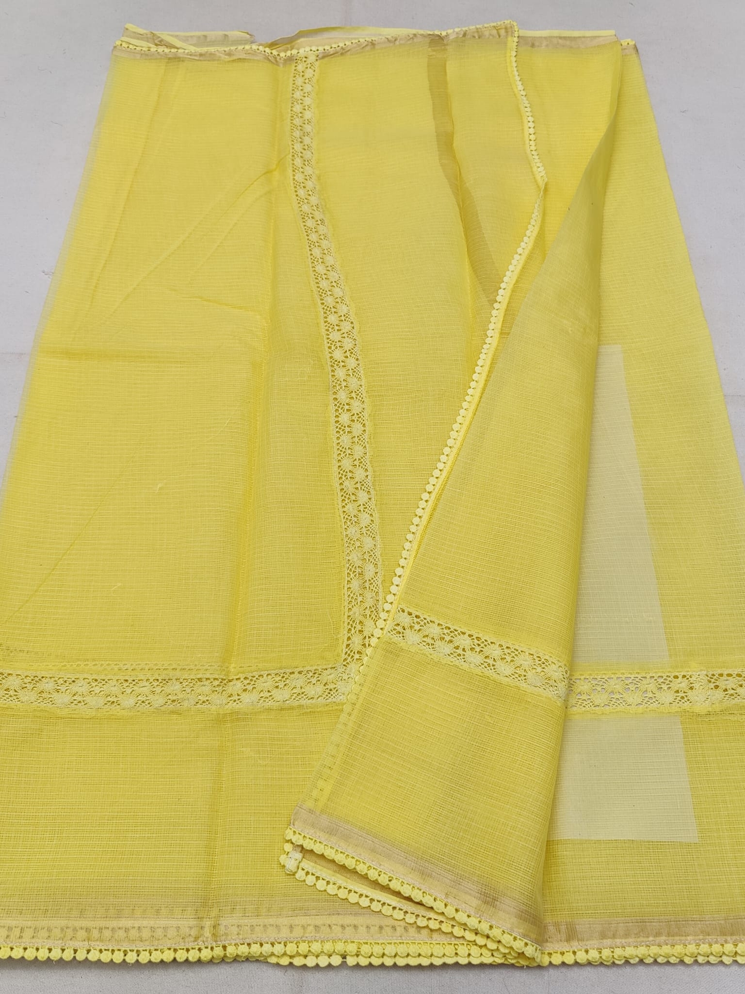 A Premium 100% Pure Cotton Kota Doriya Crochet Lace Saree Tie & Dye Plain Color With Running Blouse. The Hand Crochet Lace is Pure Cotton and Tie & Dye is done with help of Colors. The Material is Hand Woven Pure Cotton Kota Doriya Material. The Saree is of LEMON YELLOW Color. Blouse Will be LEMON YELLOW Color.