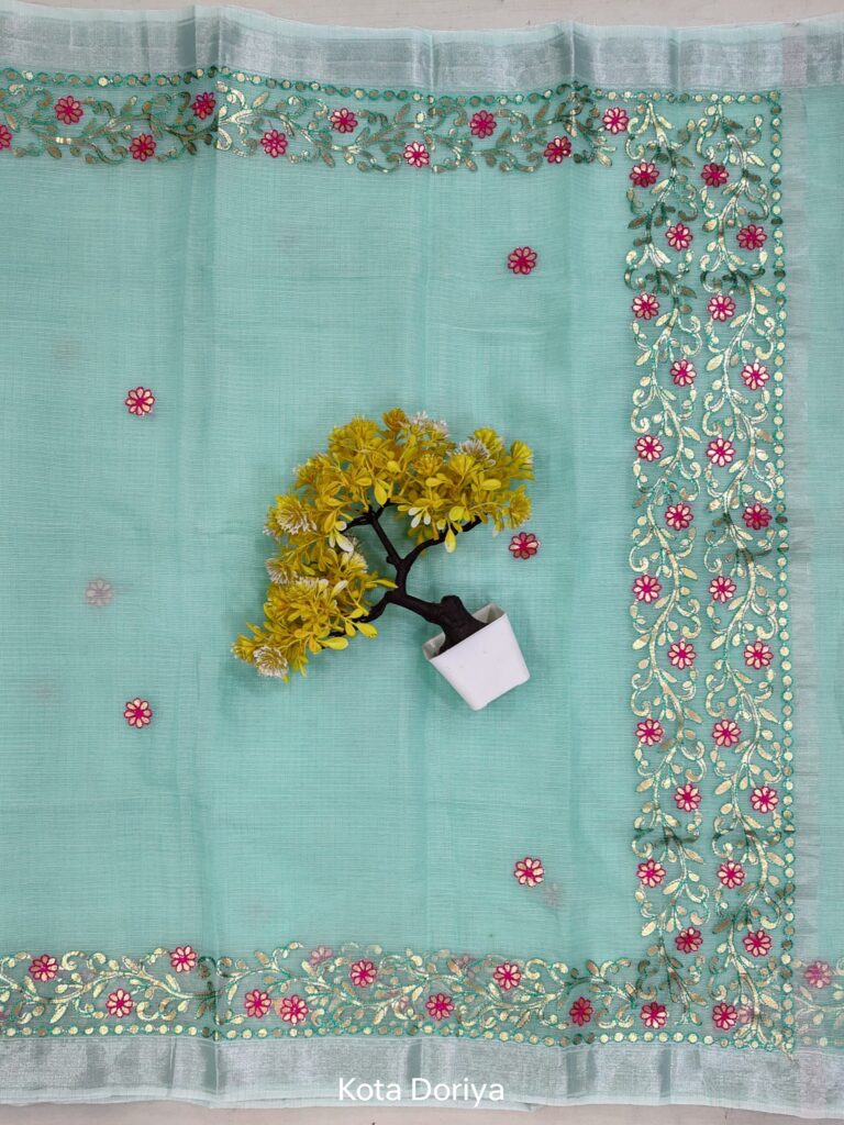 Kota Doriya is the name of a light woven fabric made of tiny woven squares (khat) which is still handwoven on traditional pit looms in Kaithoon near Kota in Rajasthan and in some of the surrounding villages. Kota Doriya Suits are made of pure cotton and silk and have square like patterns known as khats on them. The chequered weave of a Kota Saree is very popular for their lightweight and comfortable wear.