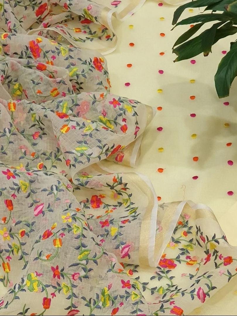 Kota Doriya Resham Embroidery Dress Material. A beautiful Resham Polka Embroidery on Kurta with Heavy Resham Embroidery Jaal on the Duppata. The Material is Hand Woven Cotton Kota Doriya Material. The Dress Material is of LEMON YELLOW color and the Bottom will be LEMON YELLOW Color.