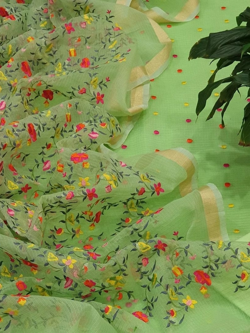 Kota Doriya Resham Embroidery Dress Material. A beautiful Resham Polka Embroidery on Kurta with Heavy Resham Embroidery Jaal on the Duppata. The Material is Hand Woven Cotton Kota Doriya Material. The Dress Material is of PARROT GREEN color and the Bottom will be PARROT GREEN Color.