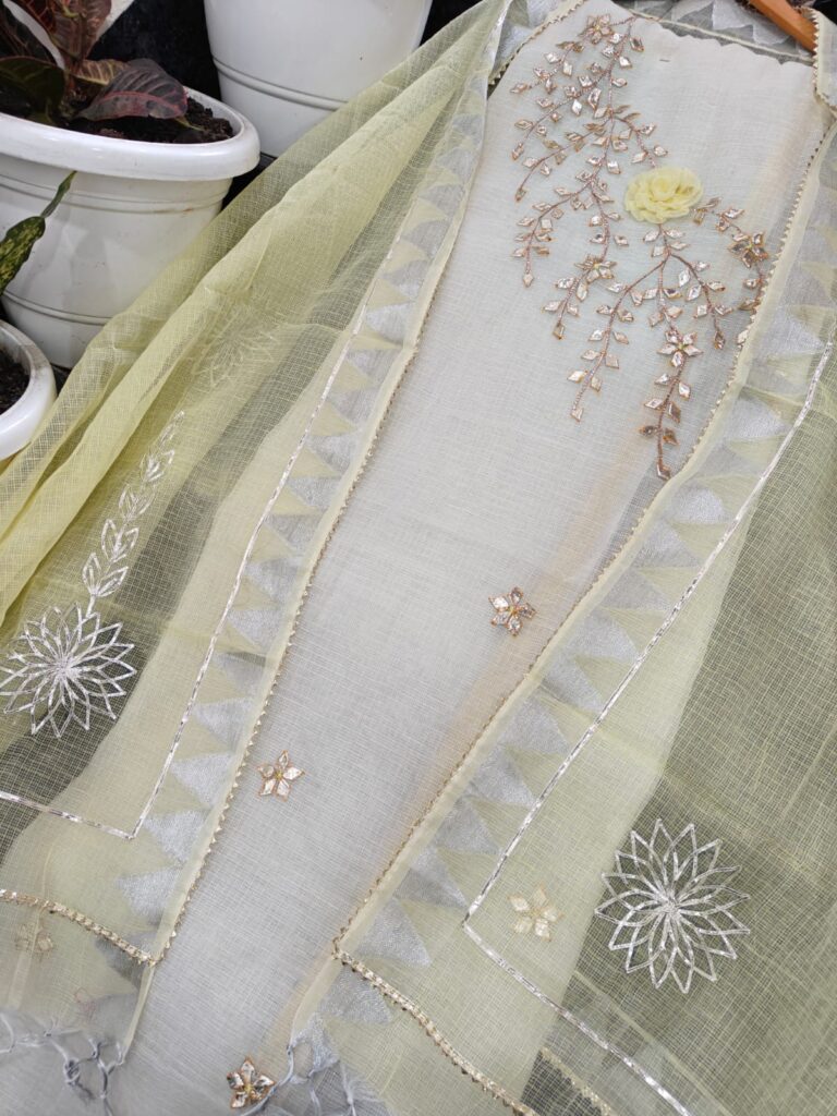 Kota Doriya is the name of a light woven fabric made of tiny woven squares (khat) which is still handwoven on traditional pit looms in Kaithoon near Kota in Rajasthan and in some of the surrounding villages. Kota Doriya Suits are made of pure cotton and silk and have square like patterns known as khats on them. The chequered weave of a Kota suit is very popular for their lightweight and comfortable wear. Kota Doriya Suits require Lining for stitching.