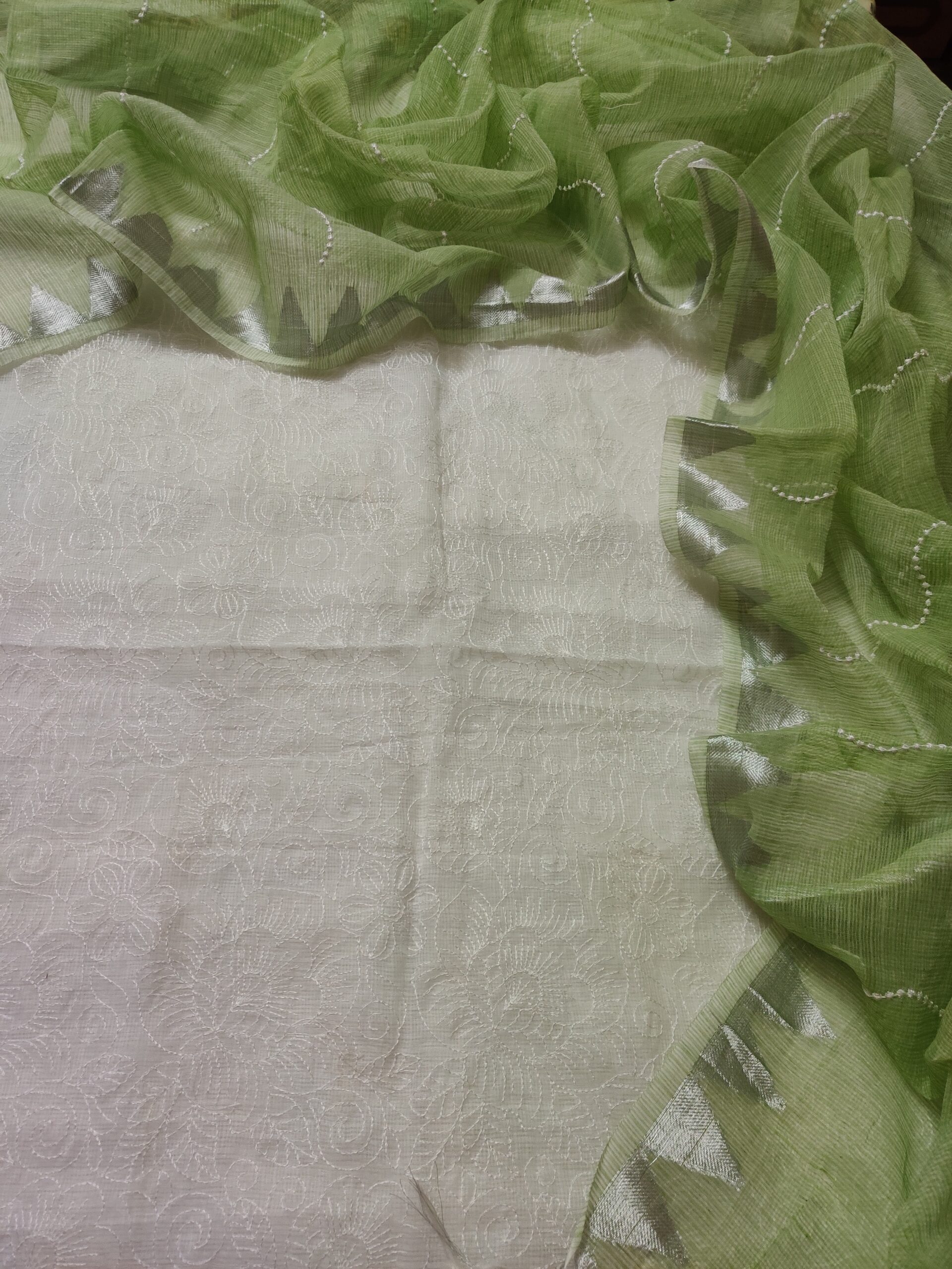 Kota Doriya Chickenkari Embroidery Dress Material with Temple Border Duppata. A Beautiful Chickenkari Embroidery on Kurta with Chickenkari Embroidery Bootis on Temple Border Duppata. The Material is Hand Woven Cotton Kota Doriya Material. The Kurta is WHITE color and Duppata is PISTA GREEN and the Bottom will be PISTA GREEN Color.
