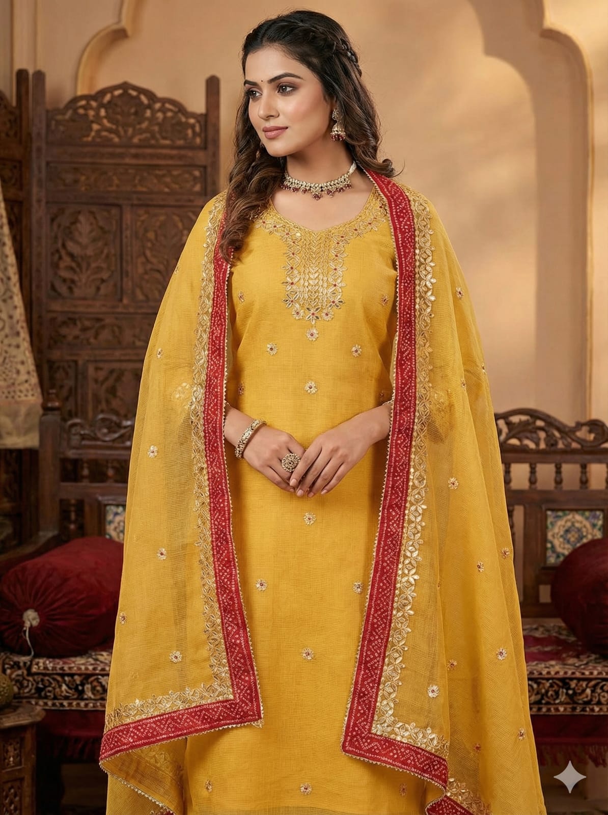 Elegant Looking Kota Doriya Gotta Bandhej Suits Dress Material. This Kota Doriya Gotta Bandhej Suits Has A Very Classy And Elegant Gotta Patti Work on Kurta with Bandhej Border Duppata on Kota Doriya Material. The Material is Hand Woven Cotton Kota Doriya Material. The Kurta and Duppata is YELLOW Color and the Bottom will be YELLOW Color.