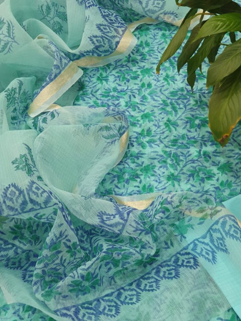 Kota Doriya is the name of a light woven fabric made of tiny woven squares (khat) which is still handwoven on traditional pit looms in Kaithoon near Kota in Rajasthan and in some of the surrounding villages. Kota Doriya Suits are made of pure cotton and silk and have square like patterns known as khats on them. The chequered weave of a Kota suit is very popular for their lightweight and comfortable wear. Kota Doriya Suits require Lining for stitching.