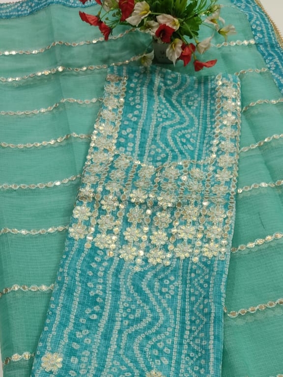 Kota Doriya Gotta Work Dress Material with Bandhej Kurta. A Very Classy And Elegant Gotta Patti Work on Kurta with Bandhej Border Duppata on Kota Doriya Material. The Material is Hand Woven Cotton Kota Doriya Material. The Kurta is SEA GREEN(RAMA) Color with SEA GREEN(RAMA) Color Duppata and the Bottom will be SEA GREEN(RAMA) Color.