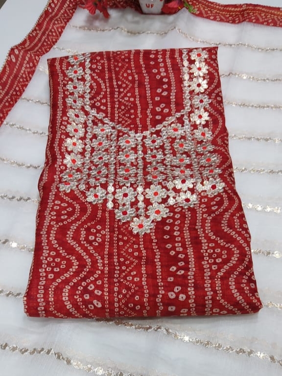 Kota Doriya Gotta Work Dress Material with Bandhej Kurta. A Very Classy And Elegant Gotta Patti Work on Kurta with Bandhej Border Duppata on Kota Doriya Material. The Material is Hand Woven Cotton Kota Doriya Material. The Kurta is RED Color with WHITE Color Duppata and the Bottom will be RED Color.