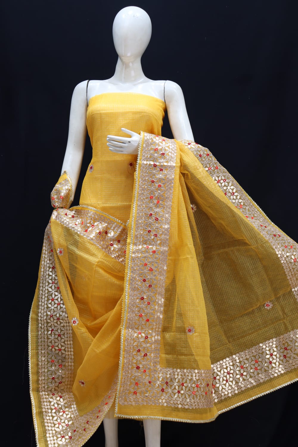 Kota Doriya Gotta Work Dress Material ON Jugnu Zari Checks Kota Doriya. A Very Classy And Elegant Kacha Gotta Work on Kurta and Duppata on Zari Checks Kota Doriya Materail. The Material is Hand Woven Cotton Kota Doriya Material. The Kurta and Duppata is YELLOW Color and the Bottom will be YELLOW Color.