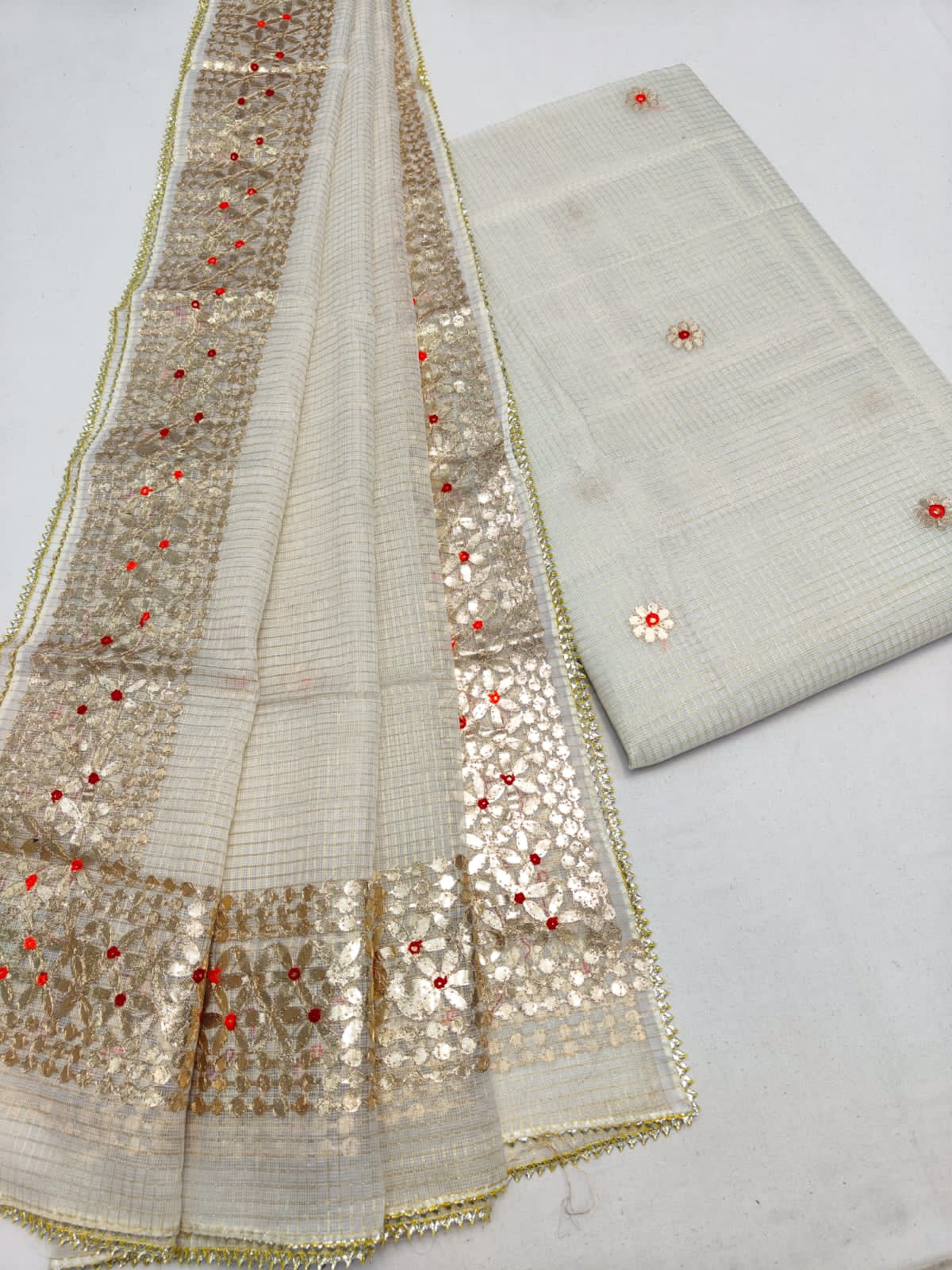 Kota Doriya Gotta Work Dress Material ON Jugnu Zari Checks Kota Doriya. A Very Classy And Elegant Kacha Gotta Work on Kurta and Duppata on Zari Checks Kota Doriya Materail. The Material is Hand Woven Cotton Kota Doriya Material. The Kurta and Duppata is WHITE Color and the Bottom will be WHITE Color.