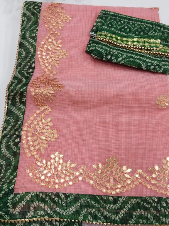 Kota Doriya Gotta Patti Work Saree With Bandhej Patch Border and Bandhej Blouse. The Gotta Patti Work is the Traditional Work of Rajasthan and is vey Famous on Kota Doriya Saree. The Material is Hand Woven Cotton Kota Doriya Material. The Saree is of LIGHT PEACH Color. Blouse Will be BOTTLE GREEN Color.