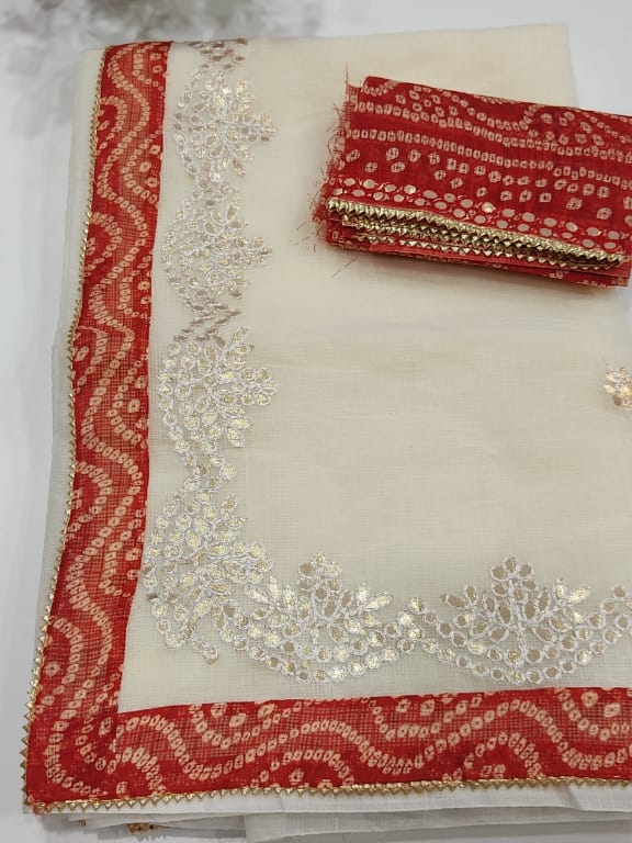 Kota Doriya Gotta Patti Work Saree With Bandhej Patch Border and Bandhej Blouse. The Gotta Patti Work is the Traditional Work of Rajasthan and is vey Famous on Kota Doriya Saree. The Material is Hand Woven Cotton Kota Doriya Material. The Saree is of CREAM Color. Blouse Will be RED Color.