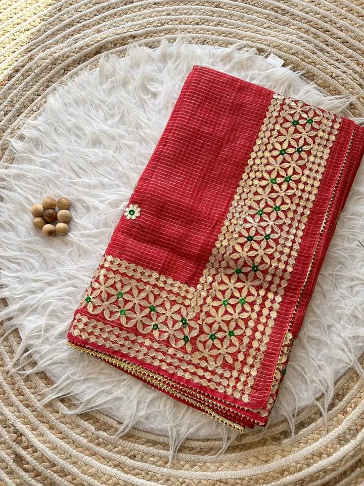 Kota Doriya Gotta Patti Work Saree on Tissue ZarimJugnu Checks with Running Blouse. The Gotta Patti Work is the Traditional Work of Rajasthan and is vey Famous on Kota Doriya Saree. The Material is Hand Woven Cotton Kota Doriya Material. The Saree is of RED Color. Blouse Will be RED Color.