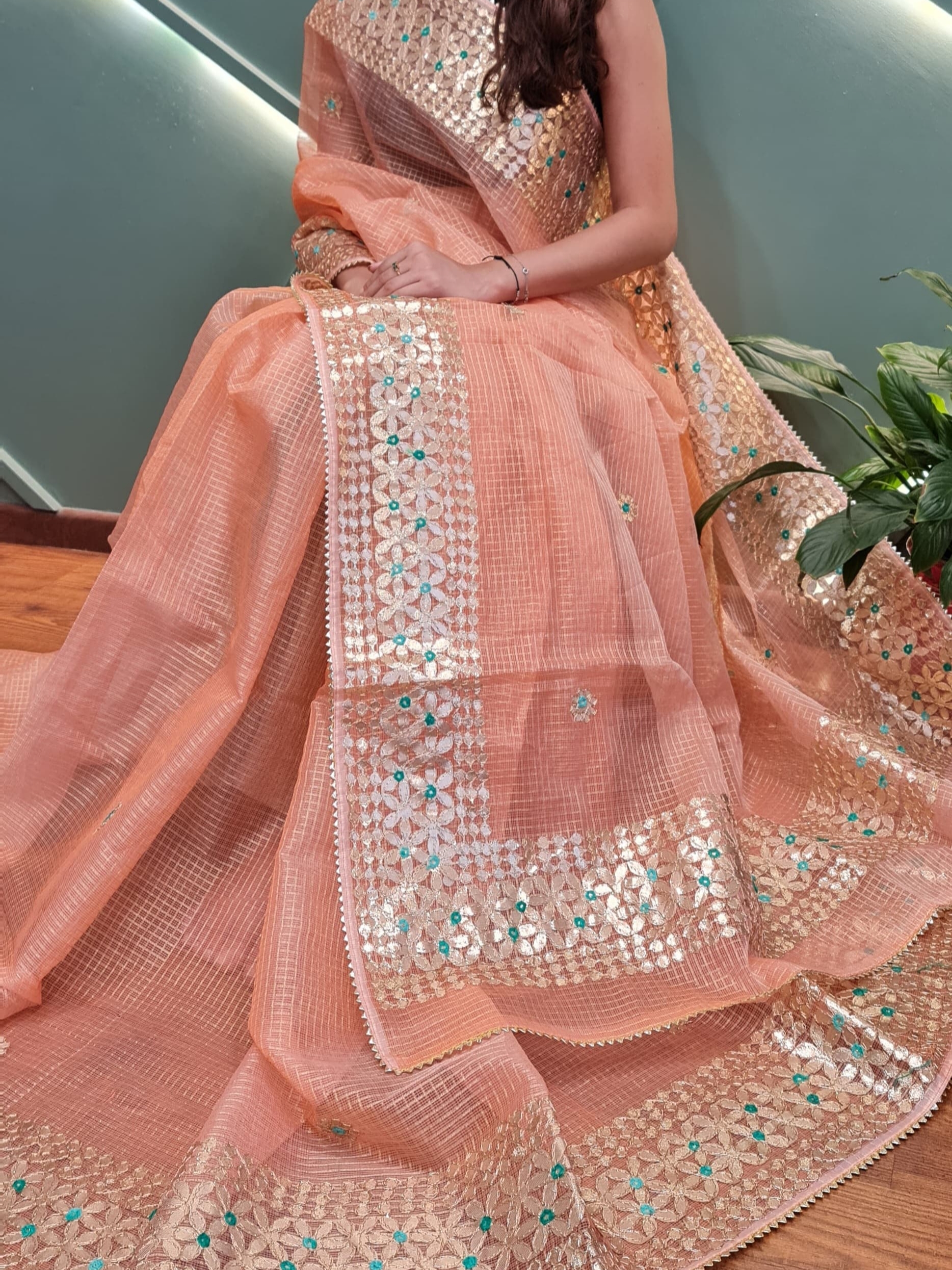 Kota Doriya Gotta Patti Work Saree on Tissue ZarimJugnu Checks with Running Blouse. The Gotta Patti Work is the Traditional Work of Rajasthan and is vey Famous on Kota Doriya Saree. The Material is Hand Woven Cotton Kota Doriya Material. The Saree is of LIGHT PEACH Color. Blouse Will be LIGHT PEACH Color.