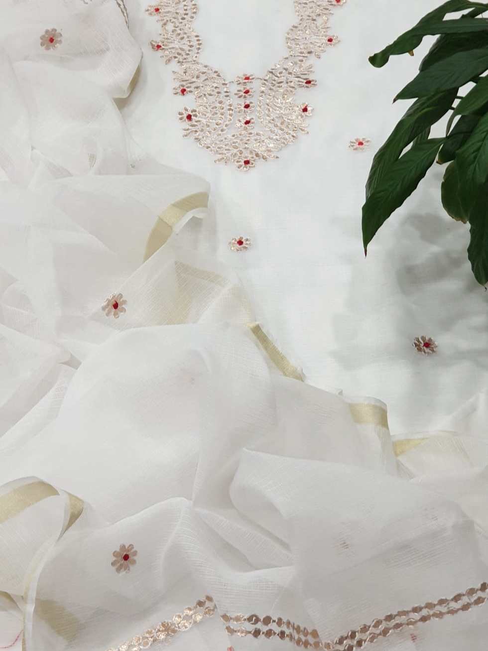 Kota Doriya Gotta Work Dress Material. A Very Classy And Elegant Gotta Patti Work on Kurta and Duppata on Kota Doriya Material. The Material is Hand Woven Cotton Kota Doriya Material. The Kurta and Duppata is WHITE Color and the Bottom will be WHITE Color.