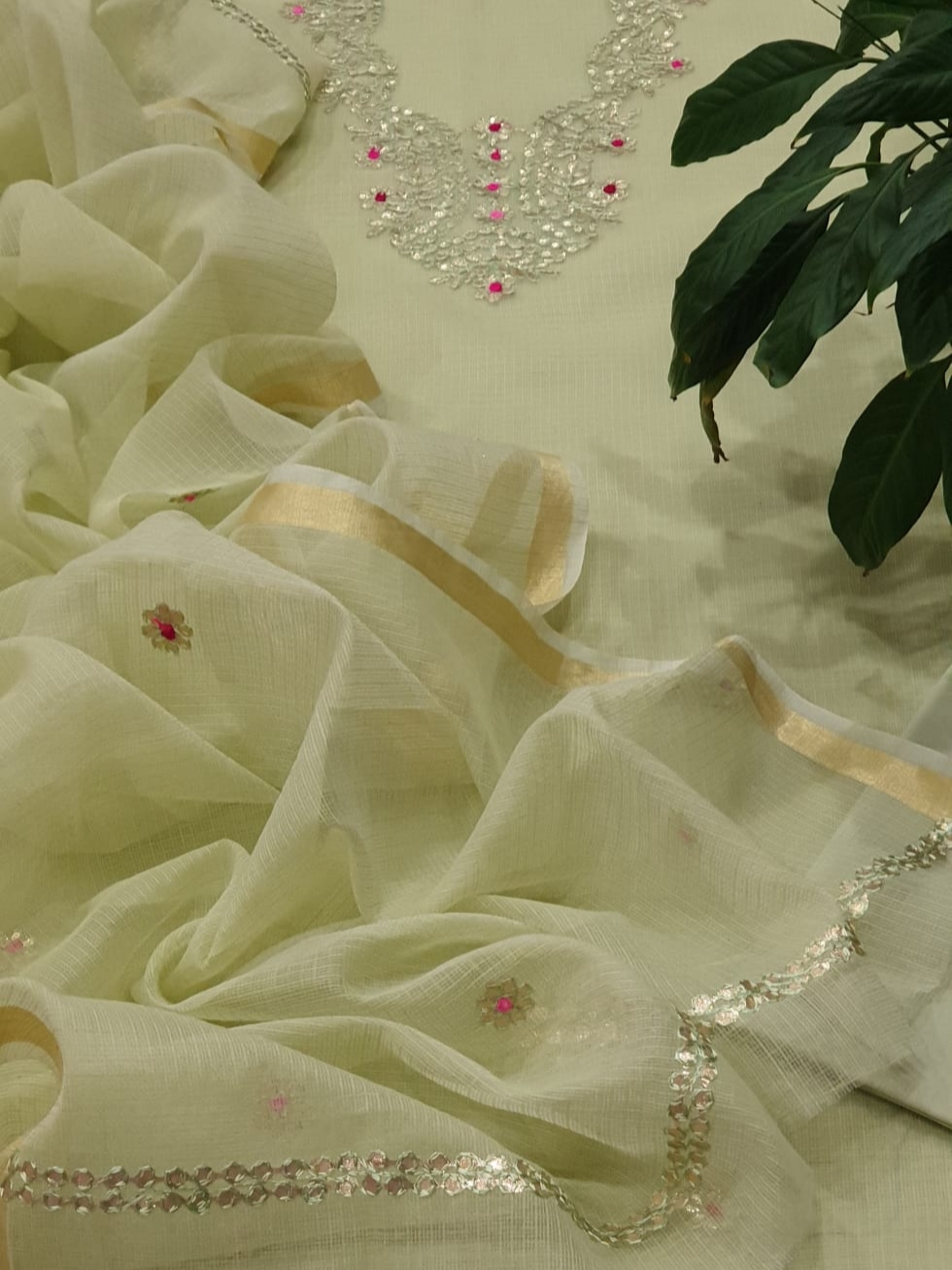 Kota Doriya Gotta Patti Suits Dress Material. A Very Classy And Elegant Gotta Patti Work on Kurta and Duppata on Kota Doriya Material. The Material is Hand Woven Cotton Kota Doriya Material. The Kurta and Duppata is PISTA GREEN Color and the Bottom will be PISTA GREEN Color. This Kota Doriya Gotta Patti Suits has a Machine Made Gotta Work with a lot of Finishing.