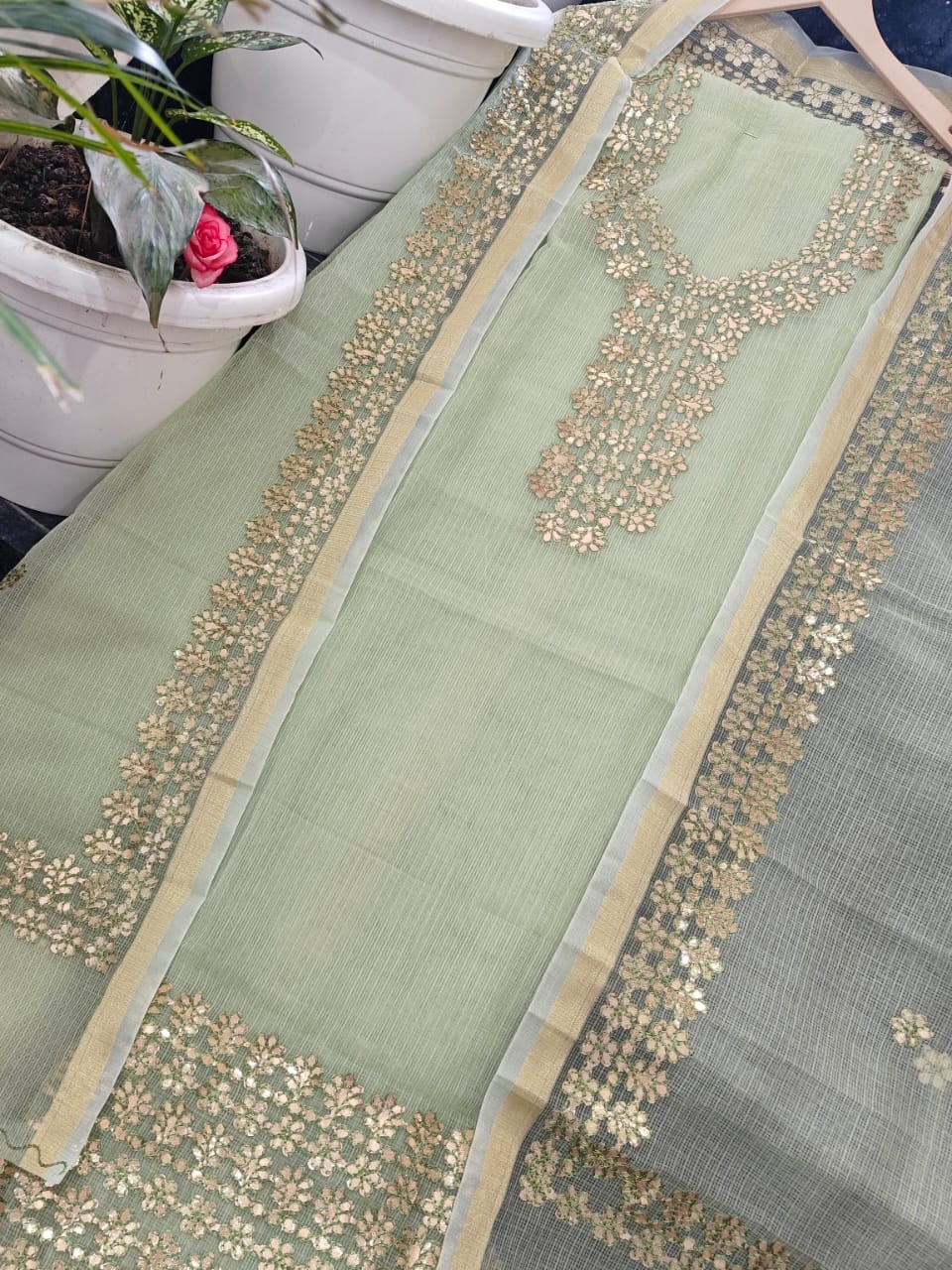 Kota Doriya Gotta Work Dress Material. A Very Classy And Elegant Gotta Patti Work on Kurta and Duppata on Kota Doriya Materail. The Material is Hand Woven Cotton Kota Doriya Material. The Kurta and Duppata is PISTA GREEN Color and the Bottom will be PISTA GREEN Color.