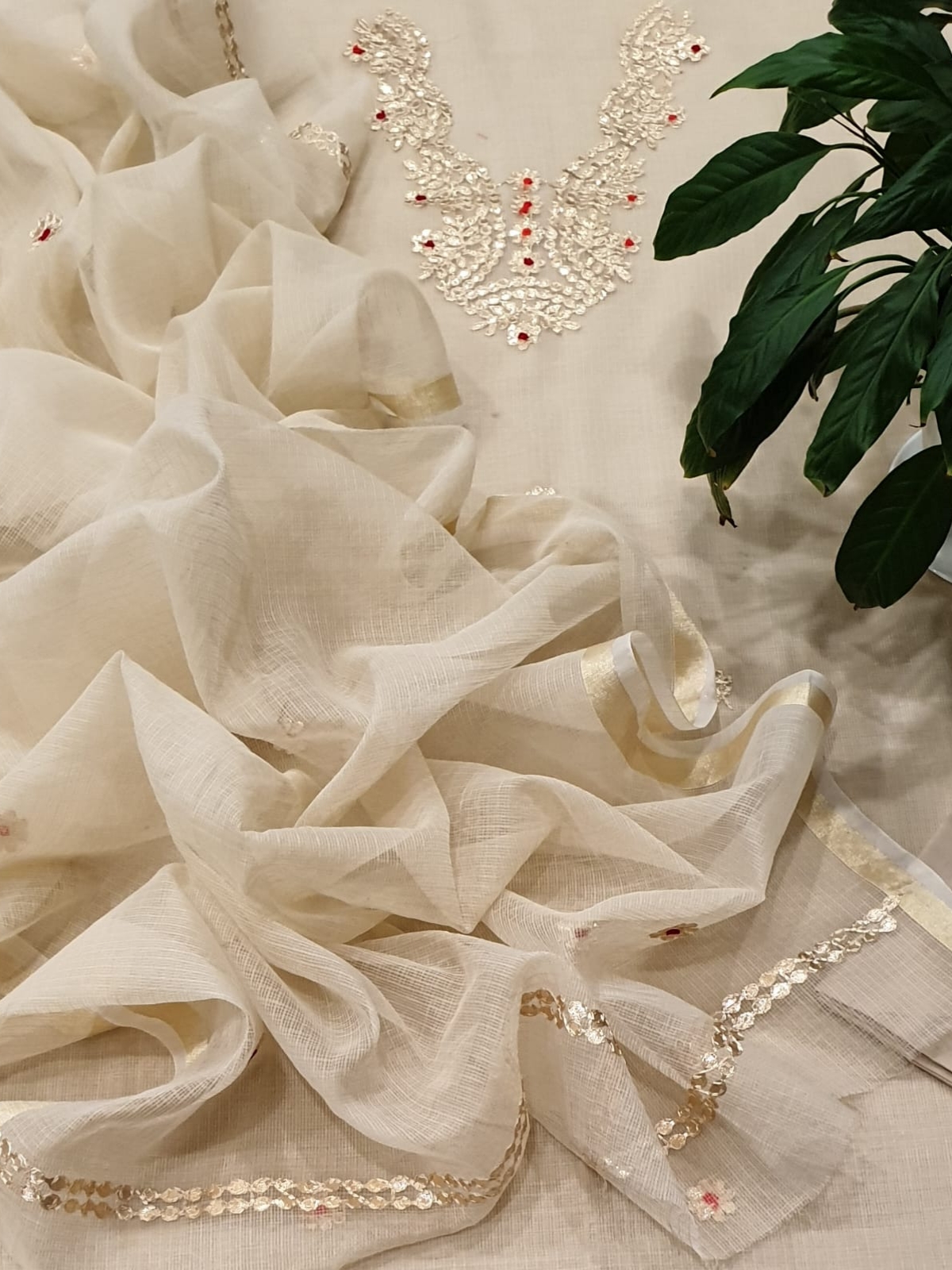 Kota Doriya Gotta Work Dress Material. A Very Classy And Elegant Gotta Patti Work on Kurta and Duppata on Kota Doriya Materail. The Material is Hand Woven Cotton Kota Doriya Material. The Kurta and Duppata is BEIGE(CHIKOO) Color and the Bottom will be BEIGE(CHIKOO) Color.