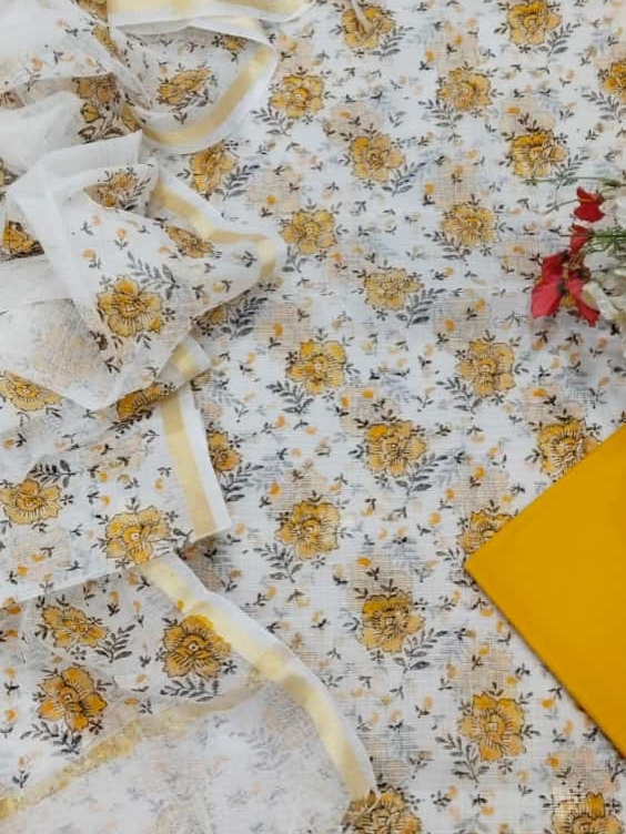 Kota Doriya Hand Block Printing Dress Material. A Preety Exclusive Hand Block Printing Work done With Hand Blocks on the Suit. The Material is Hand Woven Cotton Kota Doriya Material. The Kurta and Duppata is WHITE Color and the Bottom will be Contrast YELLOW Color.