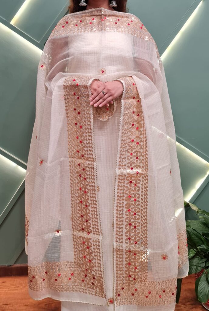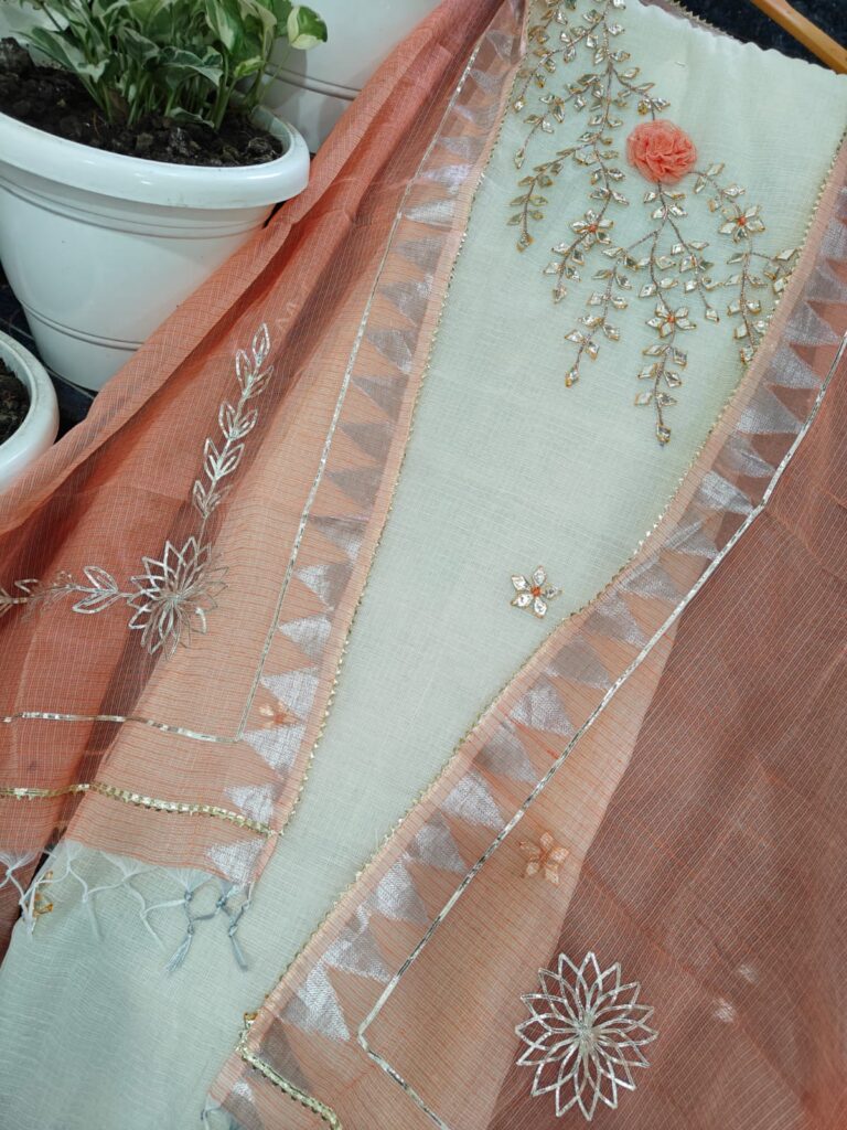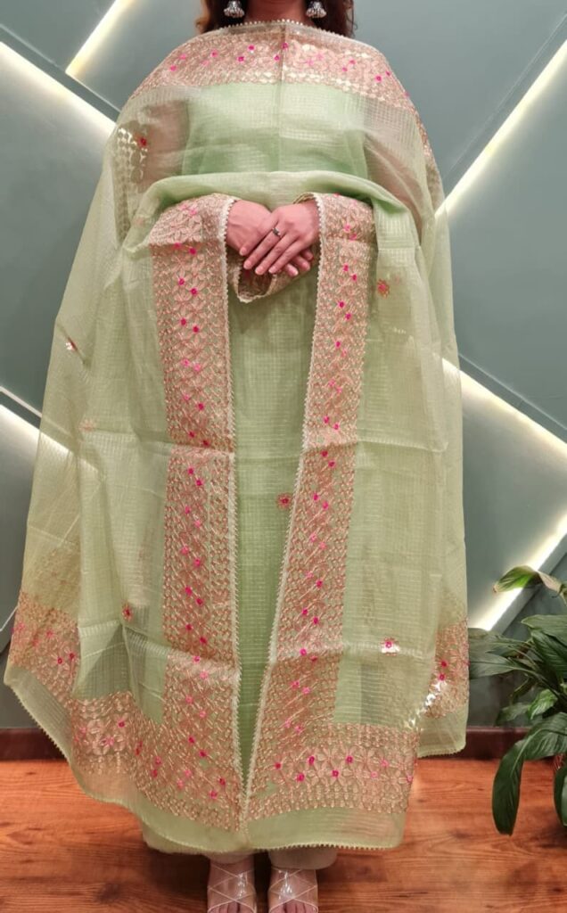 Kota Doriya is the name of a light woven fabric made of tiny woven squares (khat) which is still handwoven on traditional pit looms in Kaithoon near Kota in Rajasthan and in some of the surrounding villages. Kota Doriya Suits are made of pure cotton and silk and have square like patterns known as khats on them. The chequered weave of a Kota suit is very popular for their lightweight and comfortable wear. Kota Doriya Suits require Lining for stitching.