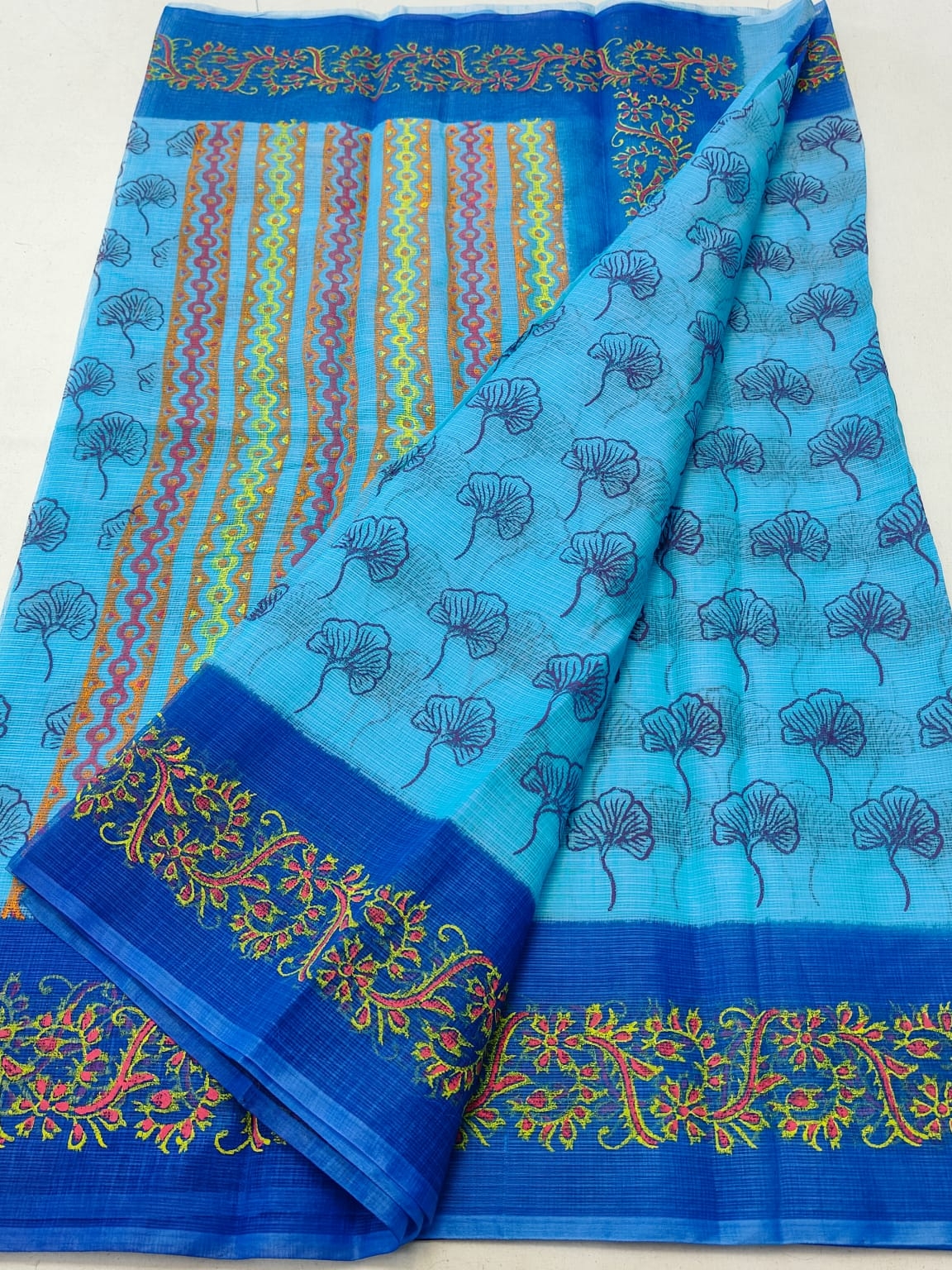 Kota Doriya Hand Block Print & Hand Dye & With Running Blouse. The Hand Block Printing is Done With Hand Using Wooden Hand Blocks & Pigment Colors. The Material is Hand Woven Cotton Kota Doriya Material. The Saree is of SKY BLUE Color. Blouse Will be SKY BLUE Color.