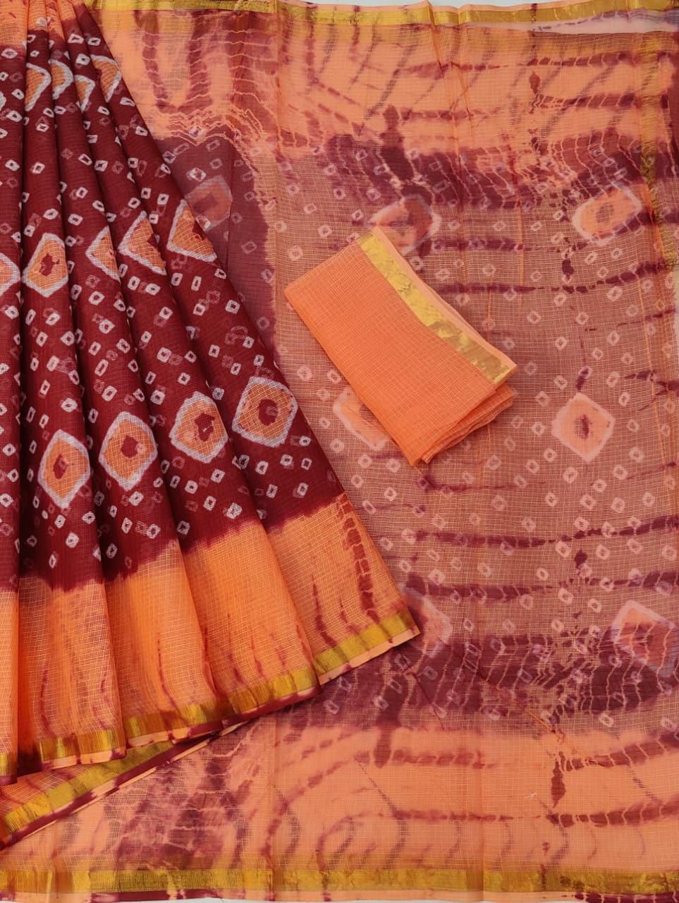 Kota Doriya Hand Tie & Dye Bandhej Saree. The Hand Tie & Dye is done is with help of Colors. The Material is Hand Woven Pure Cotton Kota Doriya Material. The Saree is Shaded in Color Consisting of MARRON and PEACH(GAJRI). Blouse Will be Contrast PEACH(GAJRI) Color.