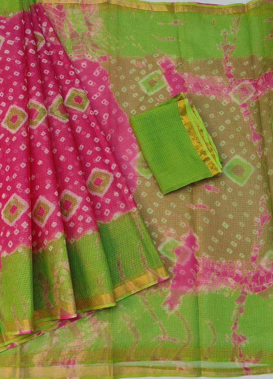 Kota Doriya Hand Tie & Dye Bandhej Saree. The Hand Tie & Dye is done is with help of Colors. The Material is Hand Woven Pure Cotton Kota Doriya Material. The Saree is Shaded in Color Consisting of MEGENTA(RANI) and MEHENDI GREEN. Blouse Will be Contrast MEHENDI GREEN Color.