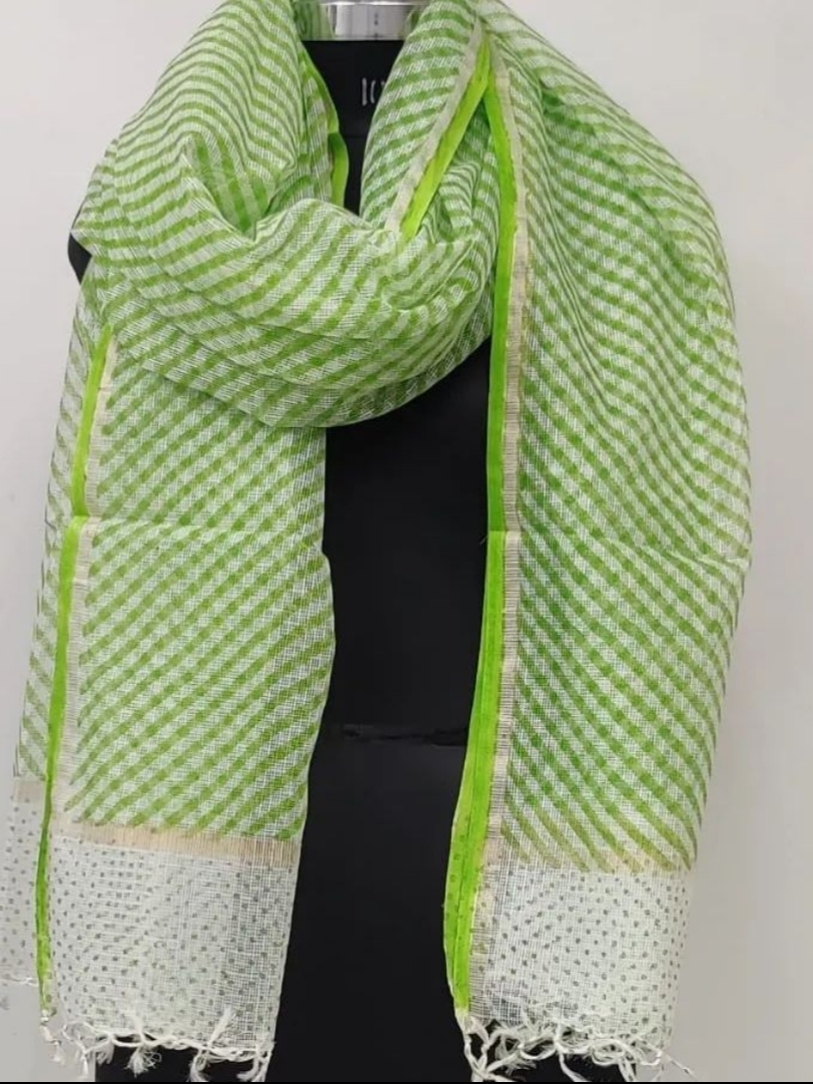 Kota Doriya Pure Cotton Duppata with Hand Block Leheriya Print and Tessels. It is Manufactured on Handloom Pure Cotton Kota Doriya Material. Duppata base is WHITE with PARROT GREEN Leheriya Block.