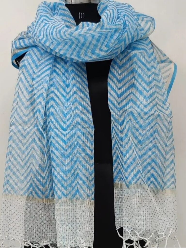Kota Doriya Pure Cotton Duppata with Hand Block Leheriya Print and Tessels. It is Manufactured on Handloom Pure Cotton Kota Doriya Material. Duppata base is WHITE with GREY Leheriya Block.