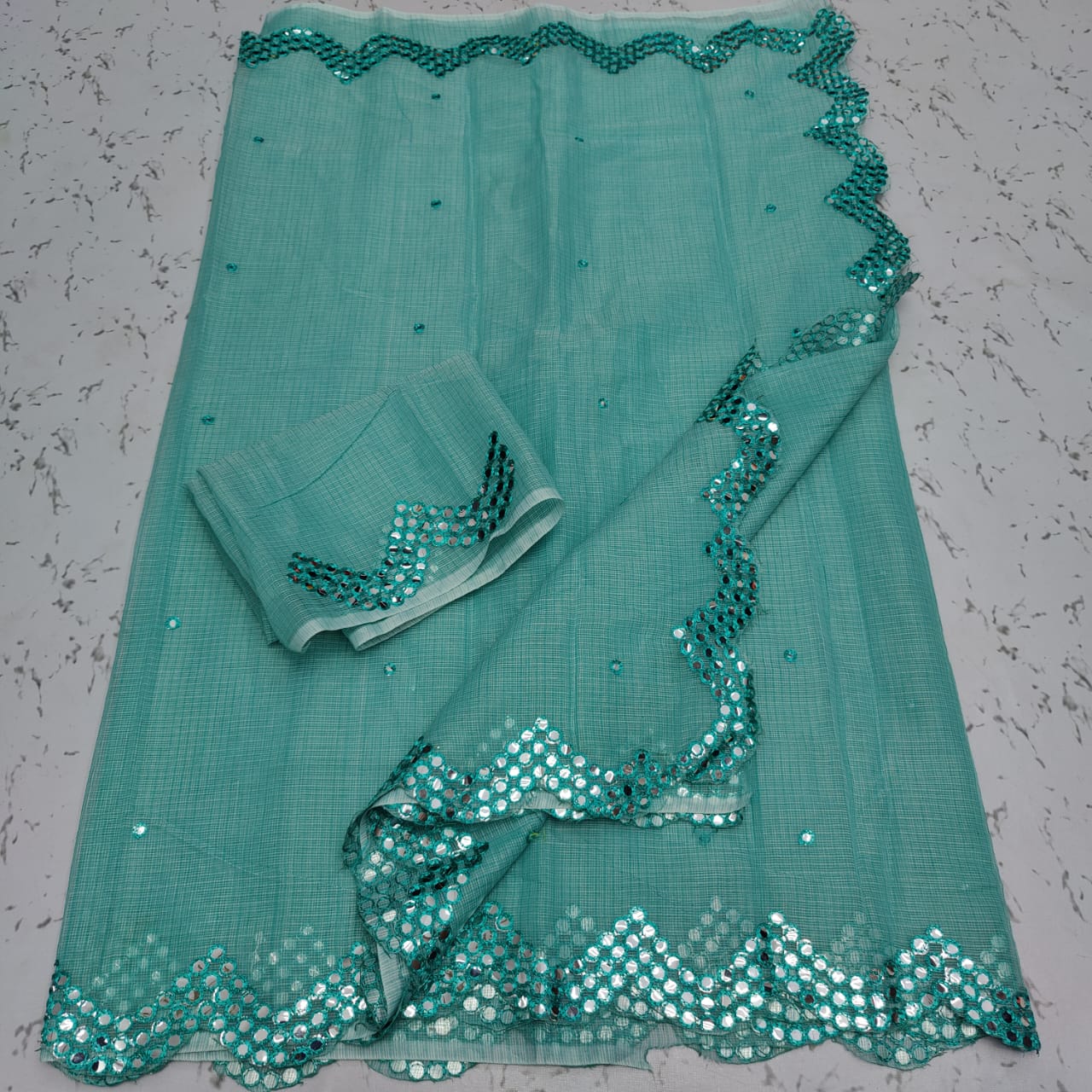 This Kota Doriya Mirror Cutwork Saree is of SEA GREEN(RAMA) Color and the Blouse will also be SEA GREEN(RAMA) Color.