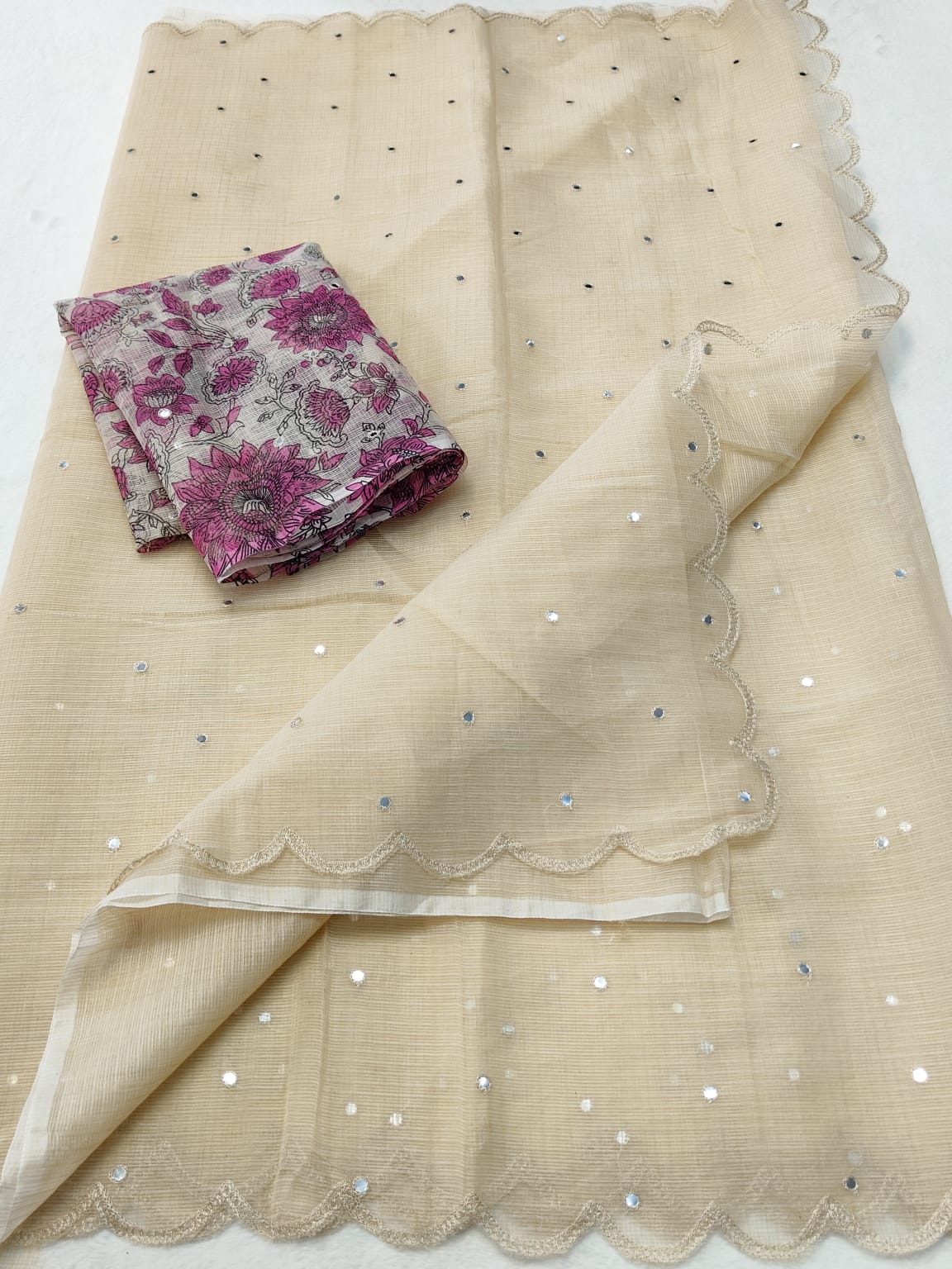 Kota Doriya Mirror Work Saree with Embroidery Cutwork Border & Printed Blouse. The Material is Hand Woven Cotton Kota Doriya Material. The Saree is of BEIGE(CHIKOO) Color. Blouse Will be BEIGE(CHIKOO) Color.