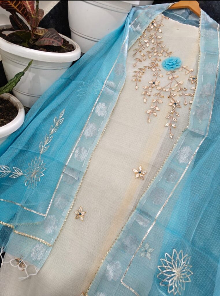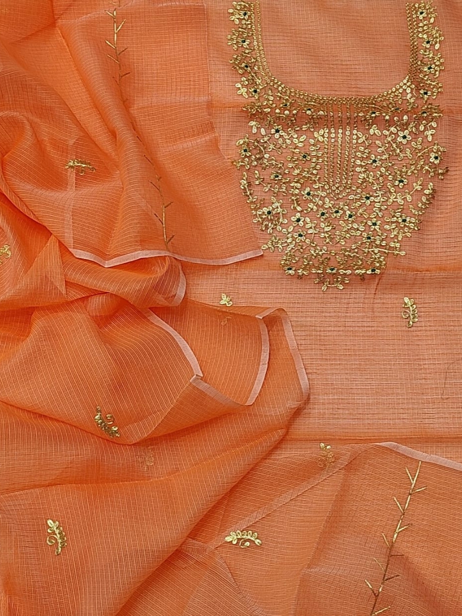 Kota Doriya is the name of a light woven fabric made of tiny woven squares (khat) which is still handwoven on traditional pit looms in Kaithoon near Kota in Rajasthan and in some of the surrounding villages. Kota Doriya Suits are made of pure cotton and silk and have square like patterns known as khats on them. The chequered weave of a Kota suit is very popular for their lightweight and comfortable wear. Kota Doriya Suits require Lining for stitching.
