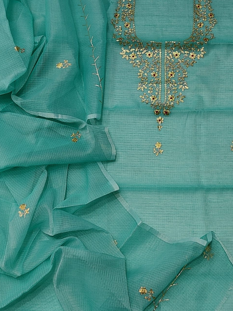 Kota Doriya Hand Pittan Work Dress Material. A Very Delicate Hand Pittan Work on Kurta and Duppata on Kota Doriya Materail. The Material is Hand Woven Cotton Kota Doriya Material. The Kurta and Duppata is SEA GREEN(RAMA) Color and the Bottom will be SEA GREEN(RAMA) Color.