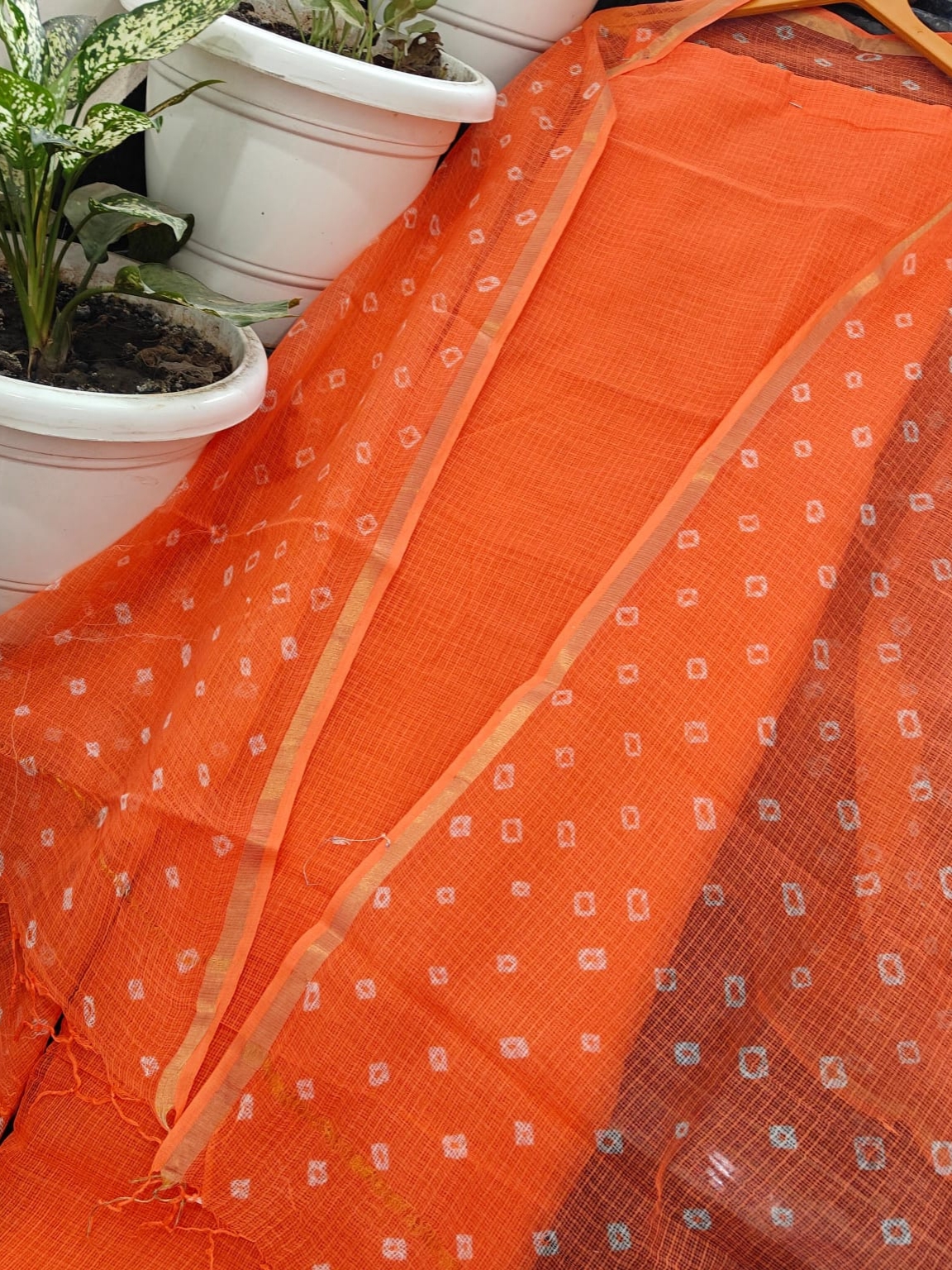 Kota Doriya Hand Tye & Dye Bandhej Dress Material. Kota Doriya Suit With Hand Tye& Dye Bandhej Duppata and Plain Kurta. The Material is Hand Woven Pure Cotton Kota Doriya Material. The Kurta and Duppata is ORANGE Color and the Bottom will be ORANGE Color.