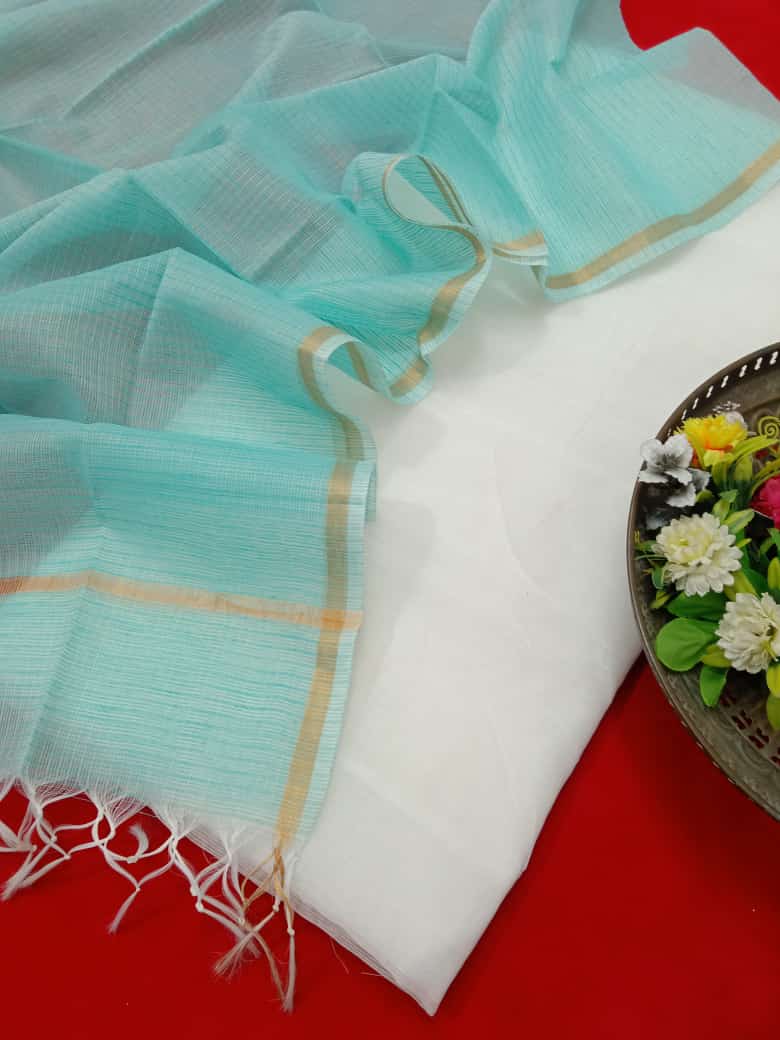 Kota Doriya Chickenkari Embroidery Dress Material. Plsin Kota Doriya Suit With Tessels Duppata. The Material is Hand Woven Cotton Kota Doriya Material. The Kurta is WHITE Color and Duppata is SEA GREEN Color and the Bottom will be SEA GREEN Color.
