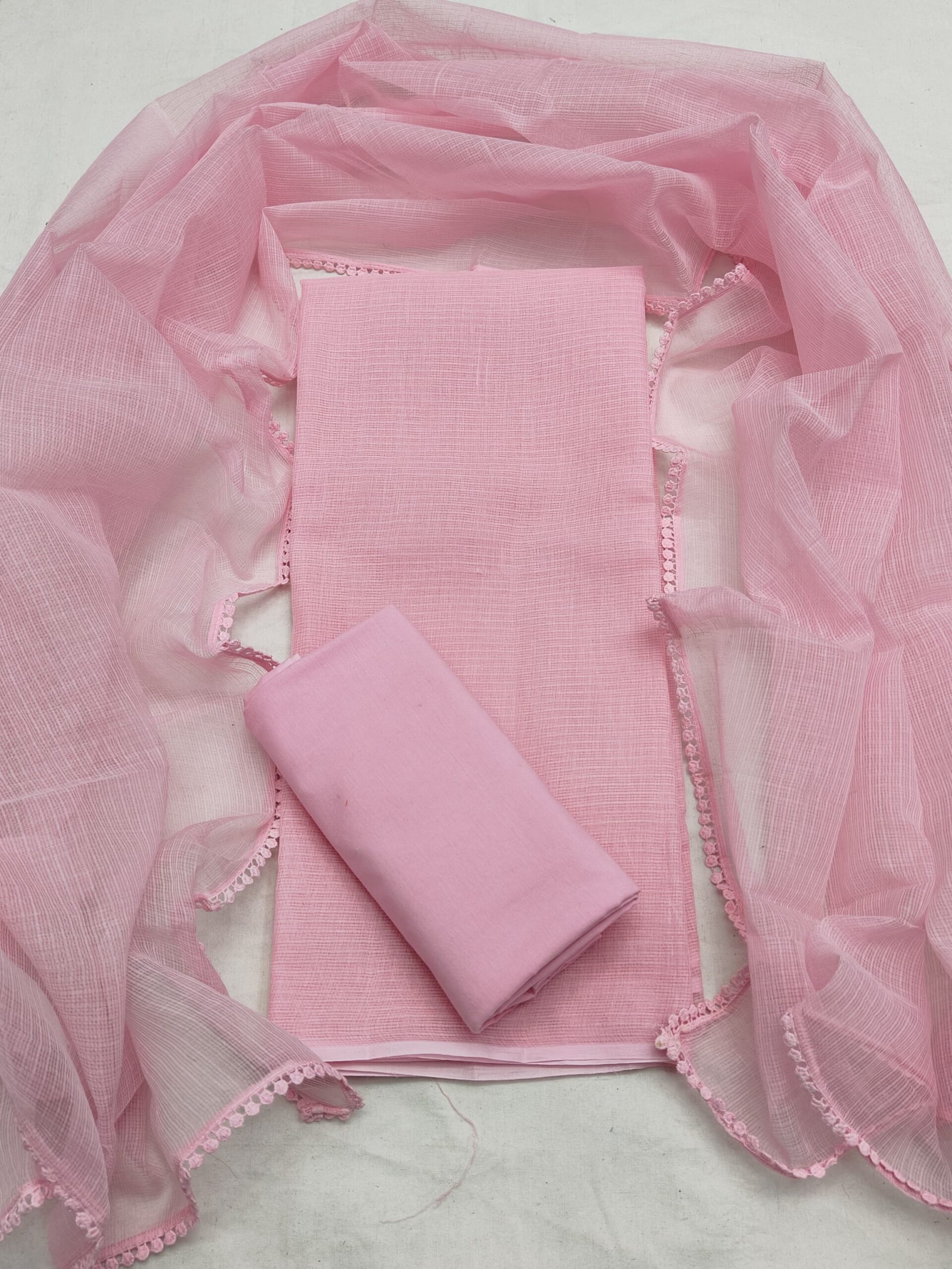 Kota Doriya Hand Dyed with Crotia Lace Dress Material. Plain Kota Doriya Suit With Croatia Lace Duppata. The Material is Hand Woven Pure Cotton Kota Doriya Material. The Kurta and Duppata is BABY PINK Color and the Bottom will be BABY PINK Color.