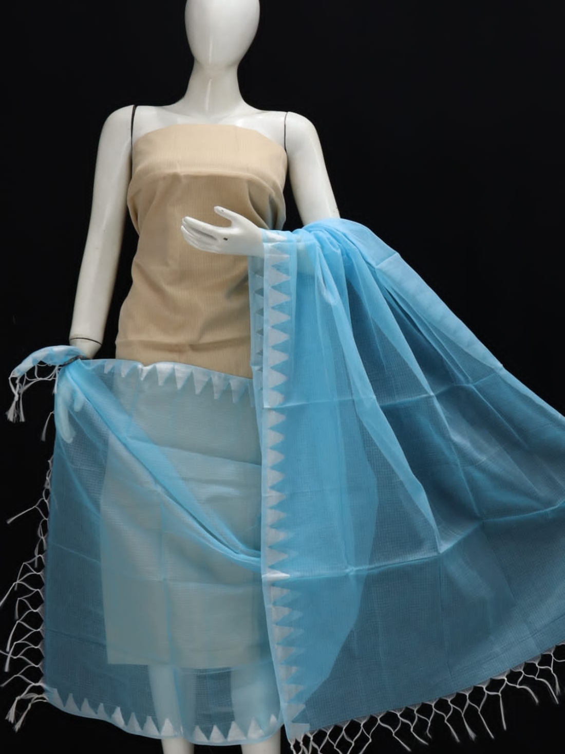 Kota Doriya Chickenkari Embroidery Dress Material. PlAIN Kota Doriya Suit With Tessels Duppata and Temple Border. The Material is Hand Woven Cotton Kota Doriya Material. The Kurta is BEIEGE(CHIKOO) Color and Duppata is SKY BLUE Color and the Bottom will be SKY BLUE Color.