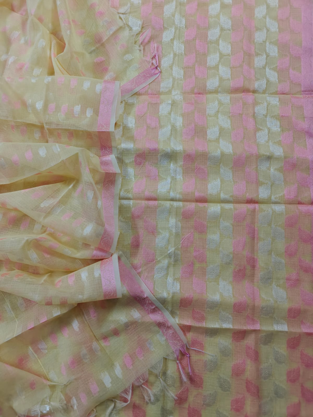 The fabric is a whisper-light Cotton Kota Doriya, renowned for its breathable and airy texture, making it the ultimate luxury for sweltering summer days. The suit features intricate Resham weaving in soft blush pink and silver tones, creating a mesmerizing interplay of texture and light against the radiant lemon-yellow backdrop.