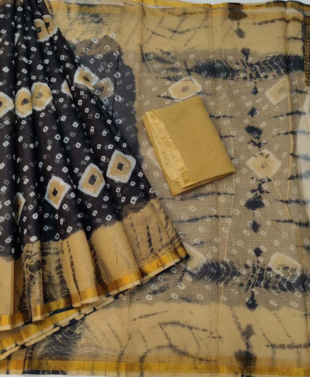 Kota Doriya Hand Tie & Dye Bandhej Saree. The Hand Tie & Dye is done is with help of Colors. The Material is Hand Woven Pure Cotton Kota Doriya Material. The Saree is Shaded in Color Consisting of BLACK and BROWN. Blouse Will be Contrast BROWN Color.