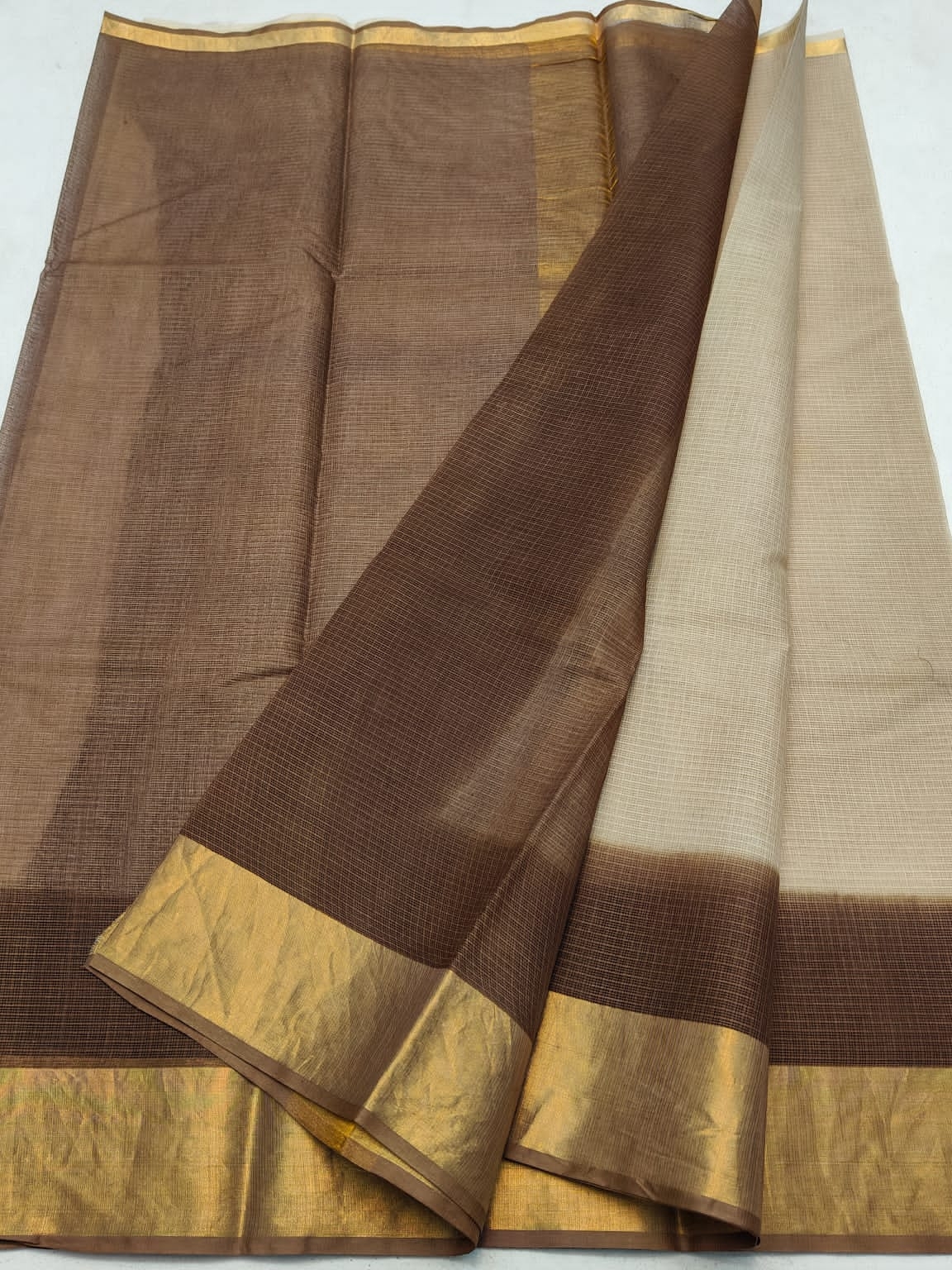 Kota Doriya Hand Tie & Dye Shaded Saree With Contrast Blouse 4/1 Zari Border. The Hand Tie & Dye is done is with help of Colors. The Material is Hand Woven Pure Cotton Kota Doriya Material. The Saree is Shaded in Color Consisting of BEIGE(CHIKOO) and BROWN. Blouse Will be Contrast BROWN Color.