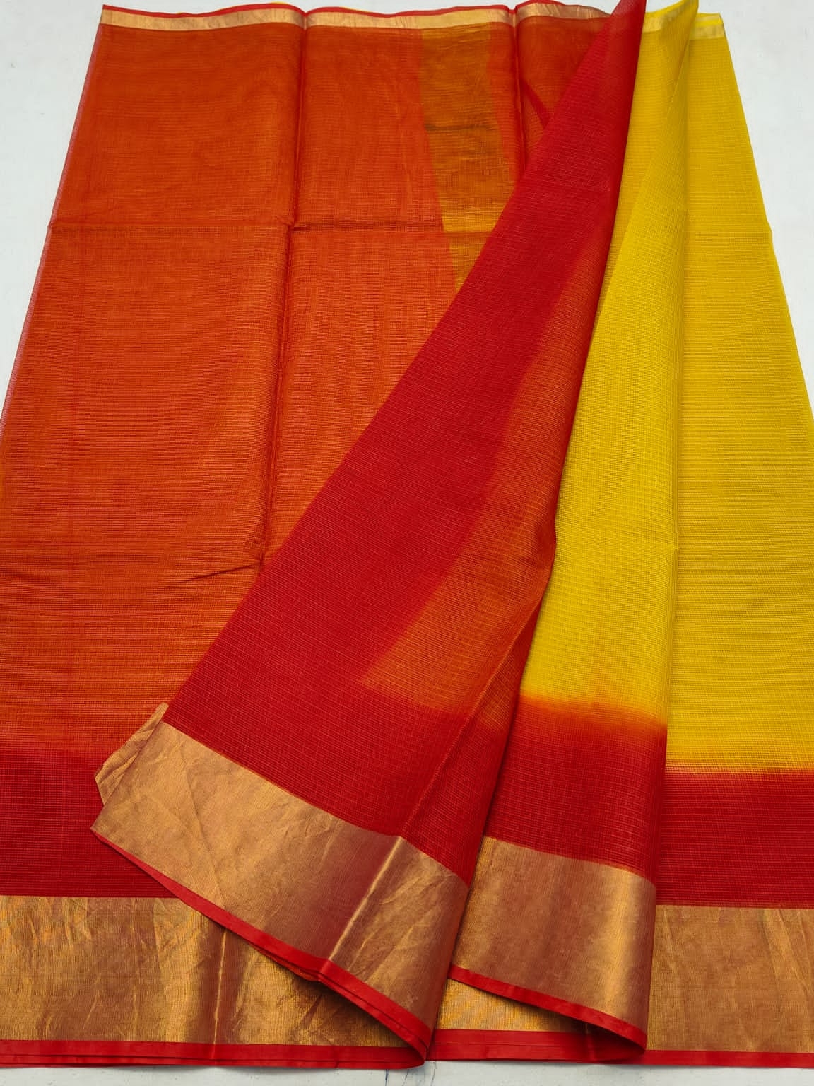 Kota Doriya Hand Tie & Dye Shaded Saree With Contrast Blouse 4/1 Zari Border. The Hand Tie & Dye is done is with help of Colors. The Material is Hand Woven Pure Cotton Kota Doriya Material. The Saree is Shaded in Color Consisting of YELLOW and RED. Blouse Will be Contrast RED Color.
