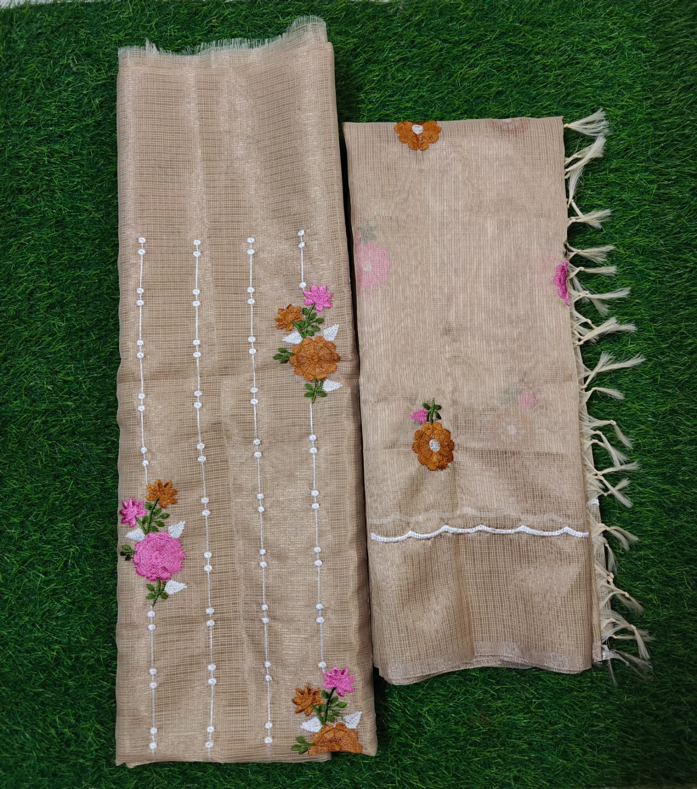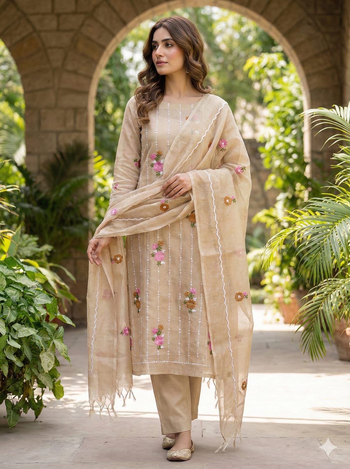 Authentic Very Lightweight Kota Doriya Tissue Embroidery Suit. This Classy Latest Kota Doriya Tissue Embroidery Suit is Perfect For Summer as the Fabric Is Very Soft And Lightweight. The Fabric of The Kota Doriya Tissue Embroidery Suit Very Soft Cotton Tissue. The Embroidery Work on The Suit is Done With Computer Machine And Is of Very Fine Quality. The Kurta Of The Suit Has A Jaal Embroidery and The Duppata Has Embroidery Bootaas With Tessels. The Suit is Of BEIGE(CHIKOO) Color And The Bottom Will Also Be BEIGE(CHIKOO) Color.